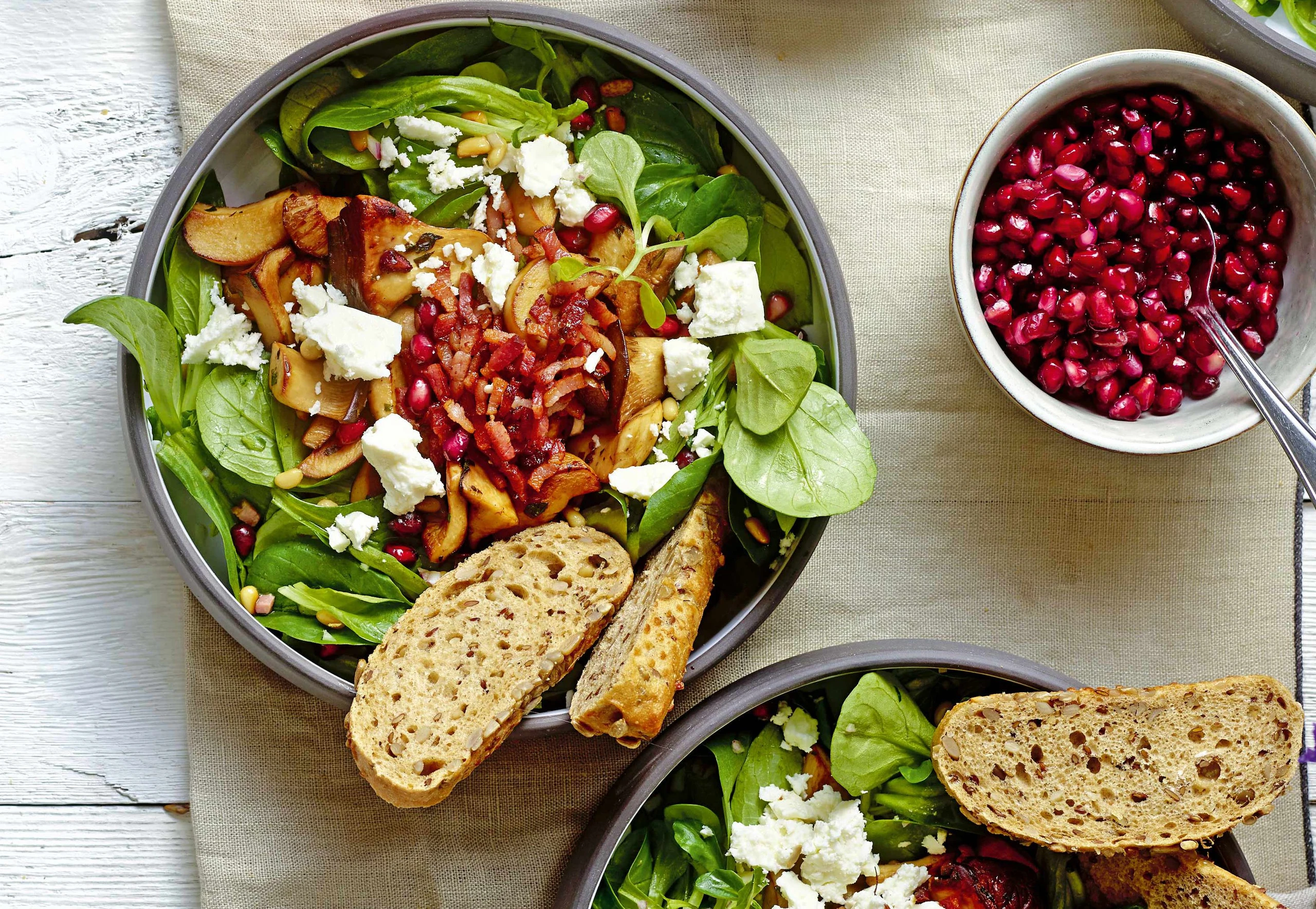 Vogerlsalat mit der Marinade vermischen. Mit Pilzen und Speck anrichten. Salat mit Feta, Granatapfelkernen und Pignoli bestreut servieren.