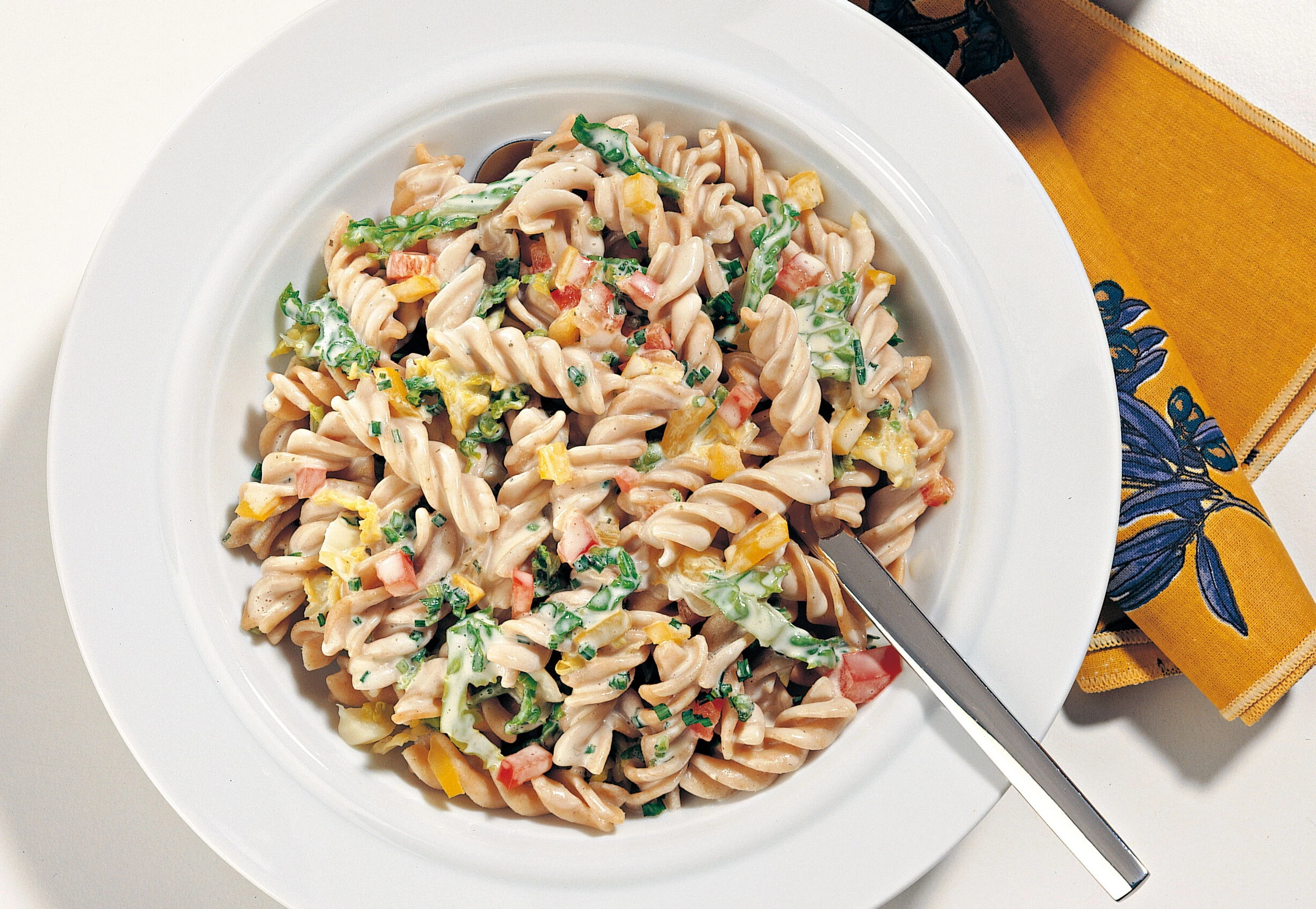 Vollkorn-Nudeln mit Paprika und Kohl