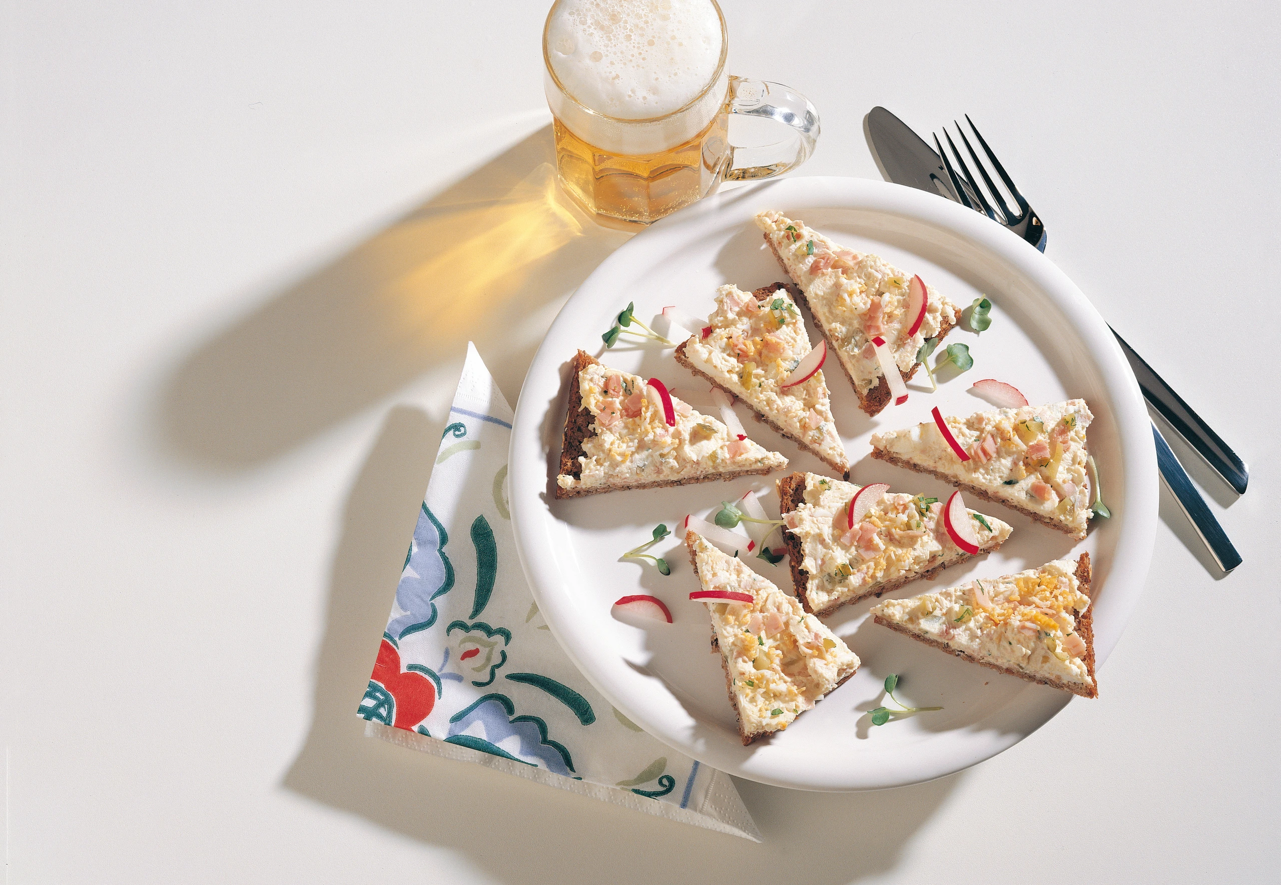 Vollkornbrote mit der Masse bestreichen, in gleichgroße Stücke schneiden und auf Tellern anrichten.