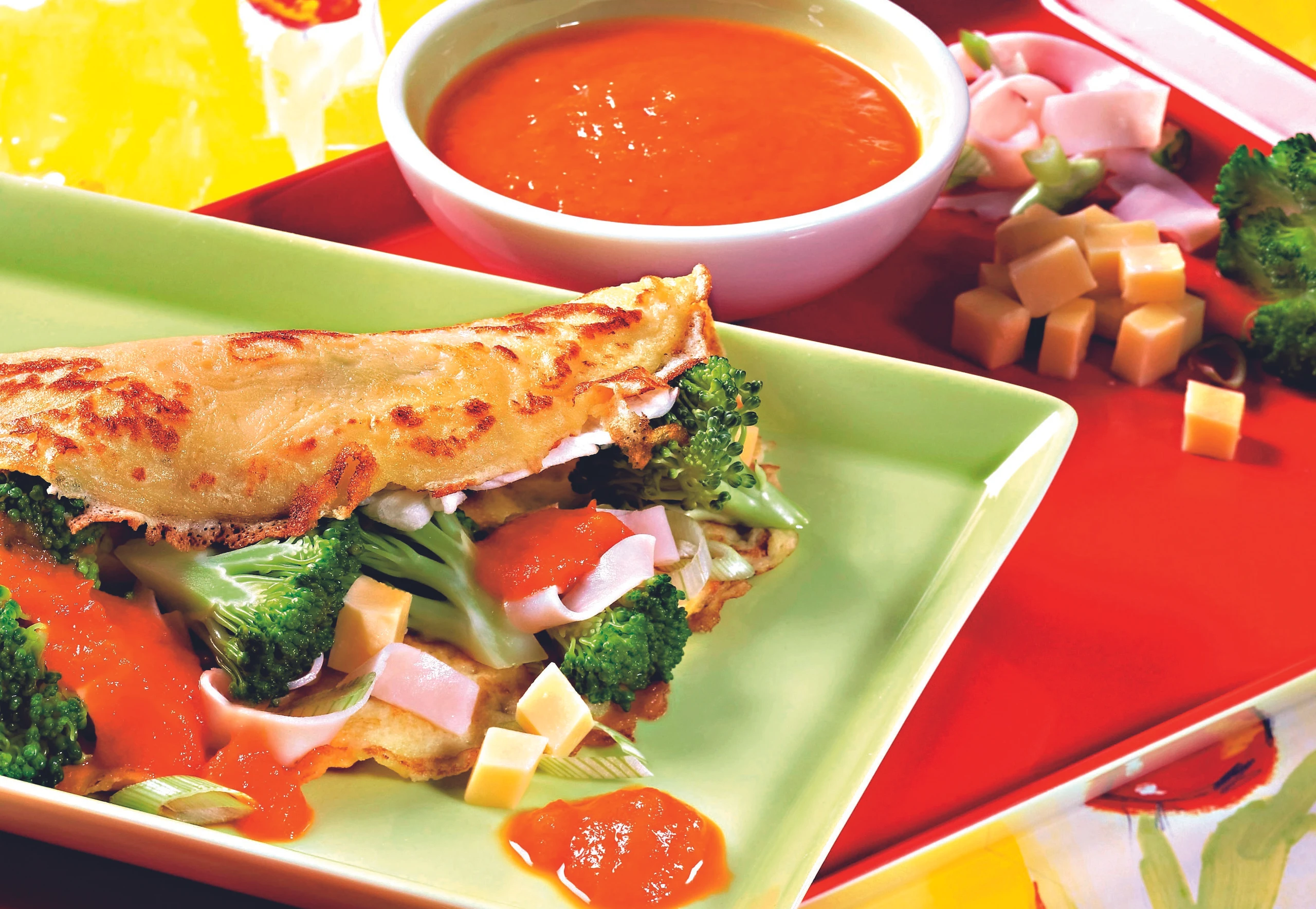 Für die Crêpes Mehl, Eier, Milch und Salz verrühren. Wenig Öl erhitzen, etwas Teig eingießen, verteilen und Crêpes backen. Crêpes mit Brokkoli, Gouda, Schinken und Jungzwiebeln füllen, mit Paprikasauce servieren.