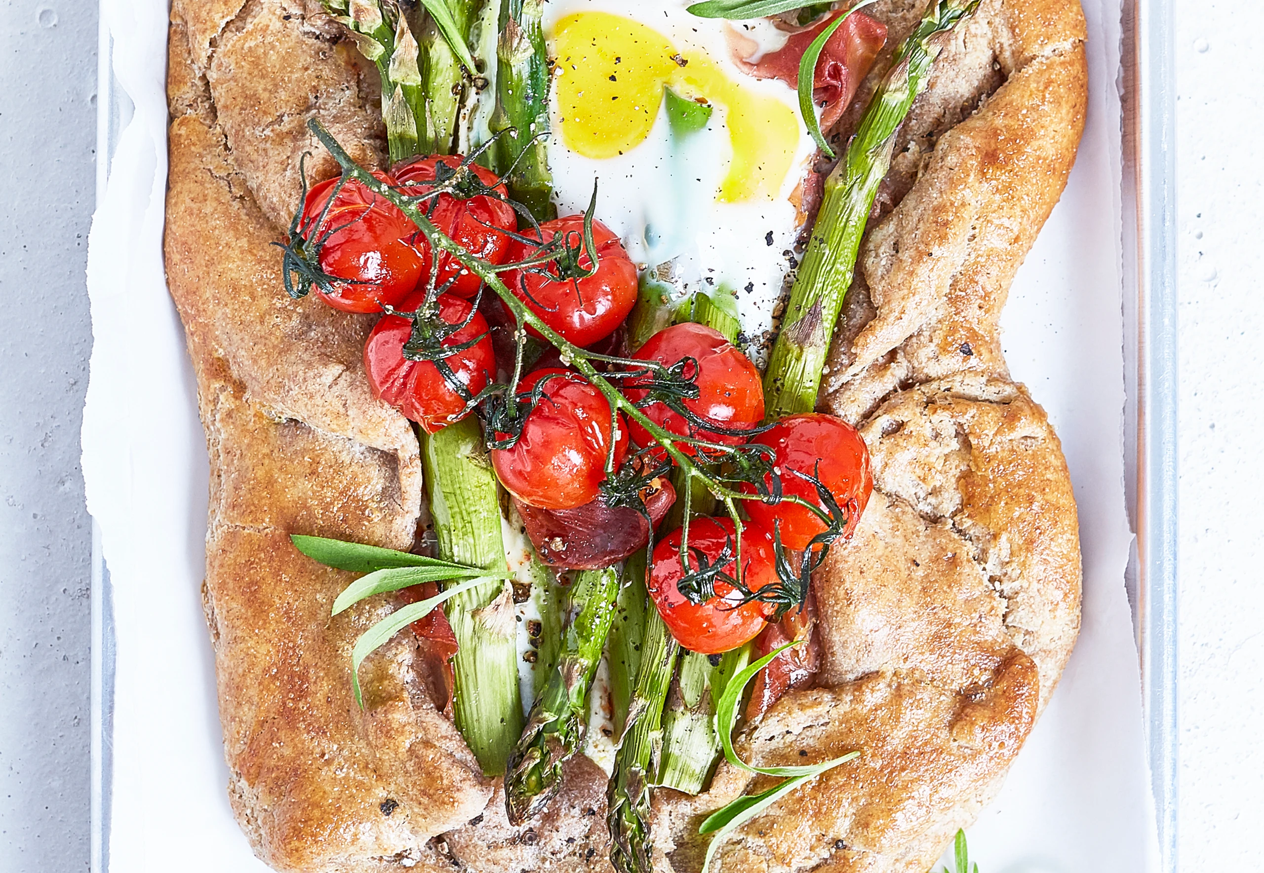 Vollkorngalette mit Spargel, Prosciutto und Ei