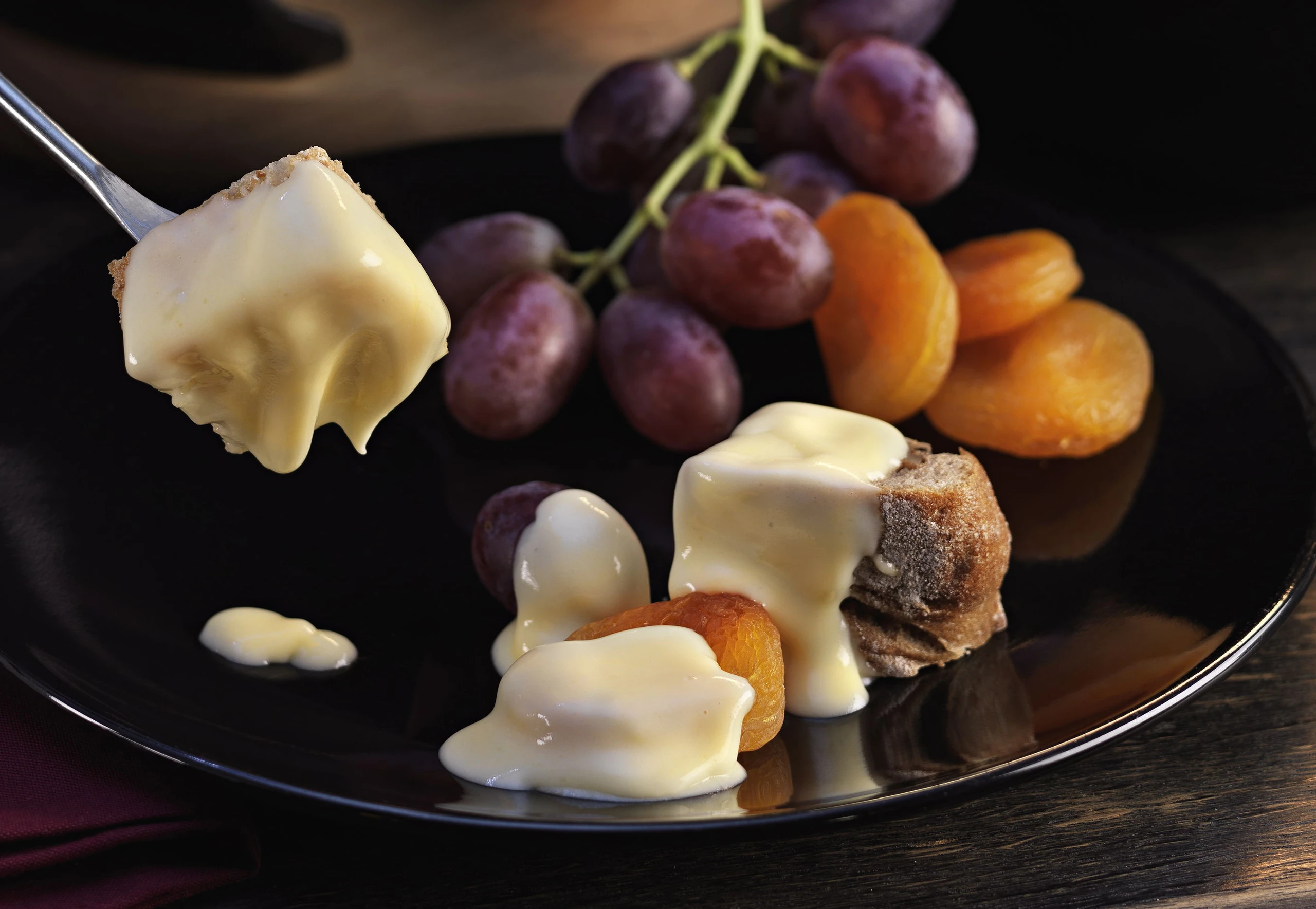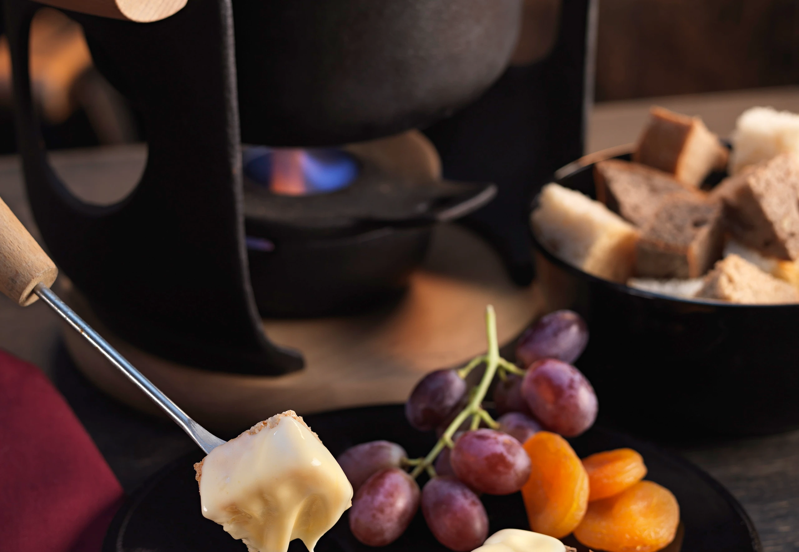Brot in mundgerechte Würfel schneiden, auf Fonduegabeln stecken und in den heißen Käse tauchen. Früchte ebenfalls in den Käse tauchen oder pur zu den Käsehäppchen essen.