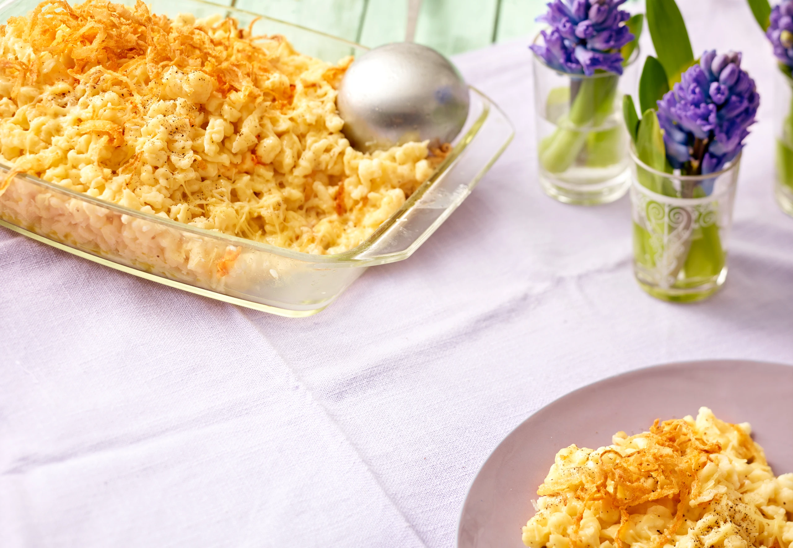 Knöpfle mit einem Gitterlöffel aus dem Wasser heben, abtropfen lassen und lagenweise in eine Form schichten. Jede Lage mit Käse bestreuen, mit einer Schicht Knöpfle abschließen.