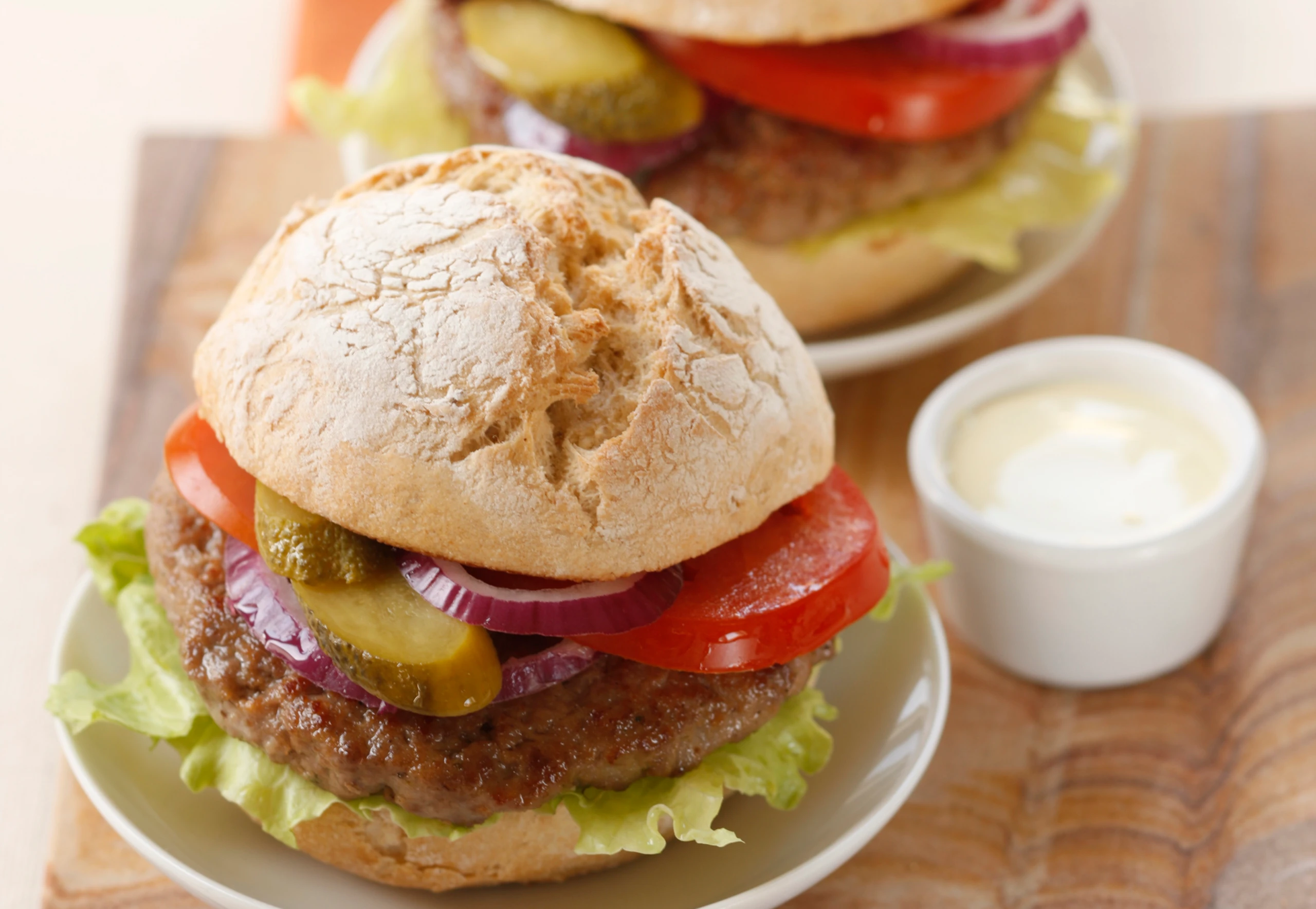 Weckerln durchschneiden und im Rohr kurz aufbacken. Parallel dazu Laibchen in Öl beidseitig braten. Weckerl-Böden mit Salat und Laibchen belegen, mit Gurkerl, Paradeisern und Zwiebeln garnieren. Deckel daraufsetzen. Burger mit der Sauce servieren.