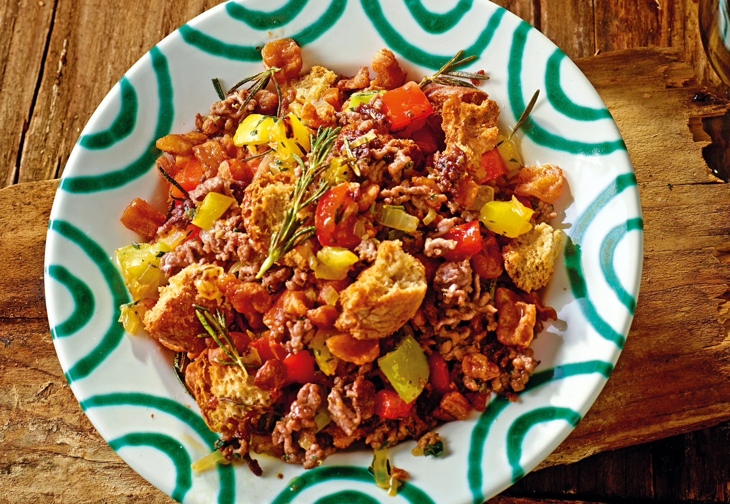Fleischmischung mit Brotstücken und Grammeln vermischen. Gröstl anrichten und eventuell mit Rosmarinzweigen garnieren.