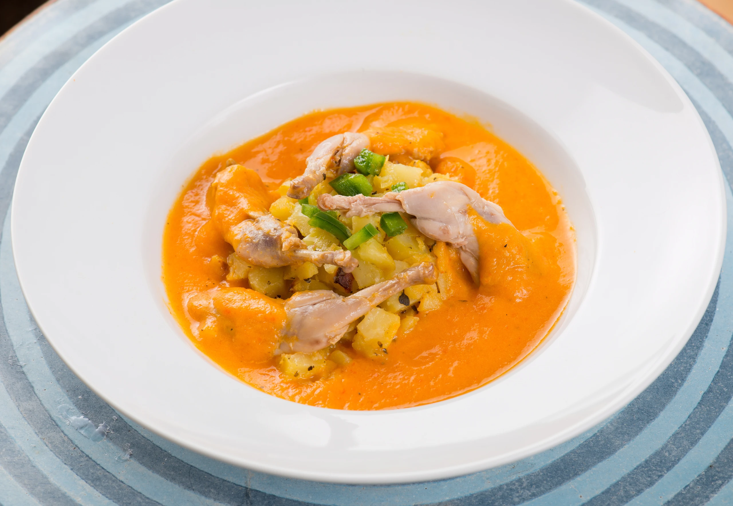 Paprika putzen, in Stücke schneiden, in wenig Öl anbraten, salzen und pfeffern. Mit restlicher Gemüsesuppe aufgießen und weich dünsten. Mit Salz, Pfeffer und Chili würzen, mit einem Stabmixer fein pürieren. Sauce durch ein Sieb passieren.