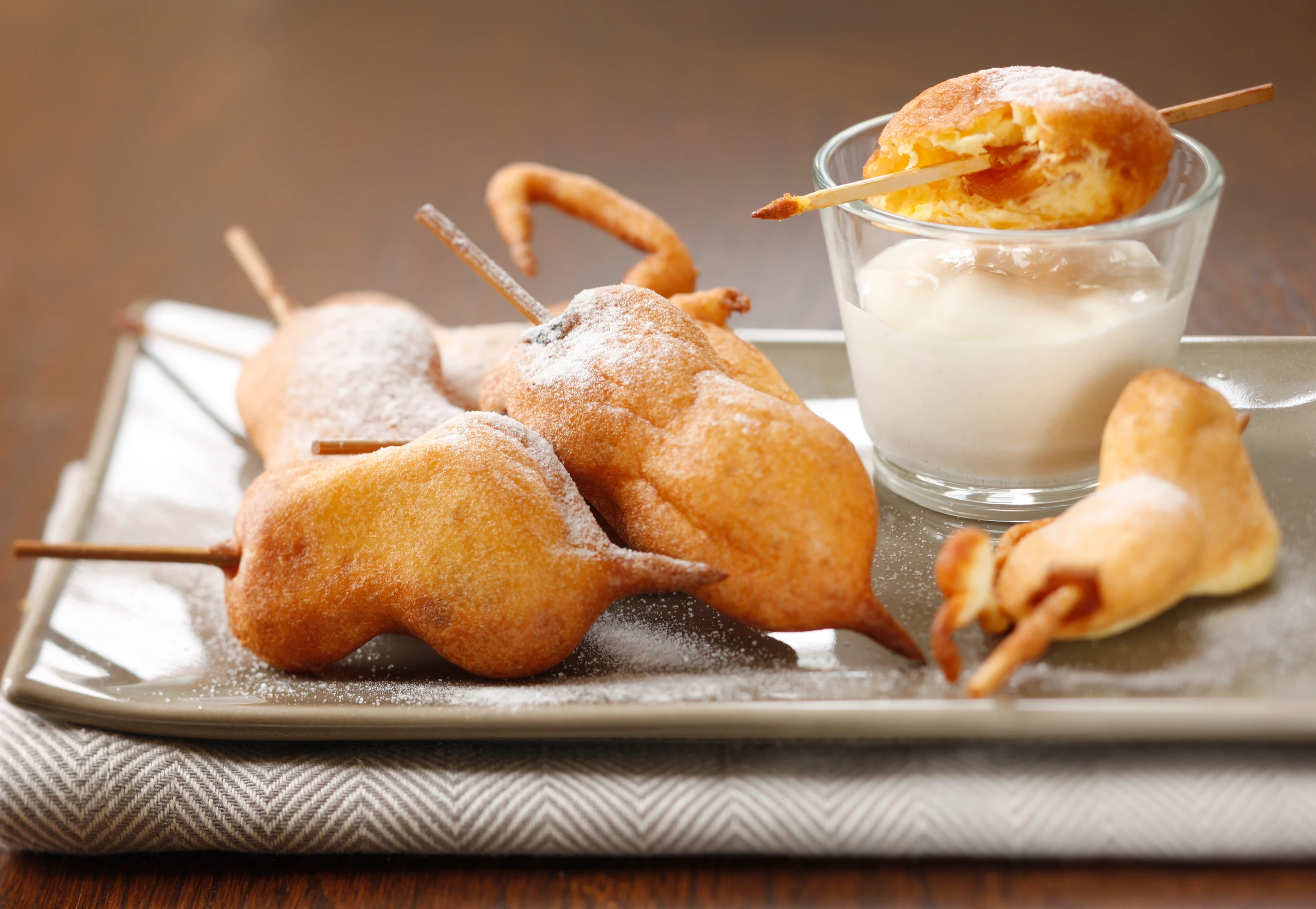 Je 2 Marillen auf kleine Holzspieße stecken. In einem Topf ca. 3 Finger hoch Öl erhitzen. Marillen in den Teig tauchen, ein wenig abtropfen lassen und im heißen Öl goldbraun backen. Mit einem Gitterlöffel herausheben und auf Küchenpapier gut abtropfen lassen. Spieße anrichten, mit Zucker bestreuen und mit der Sauce servieren.