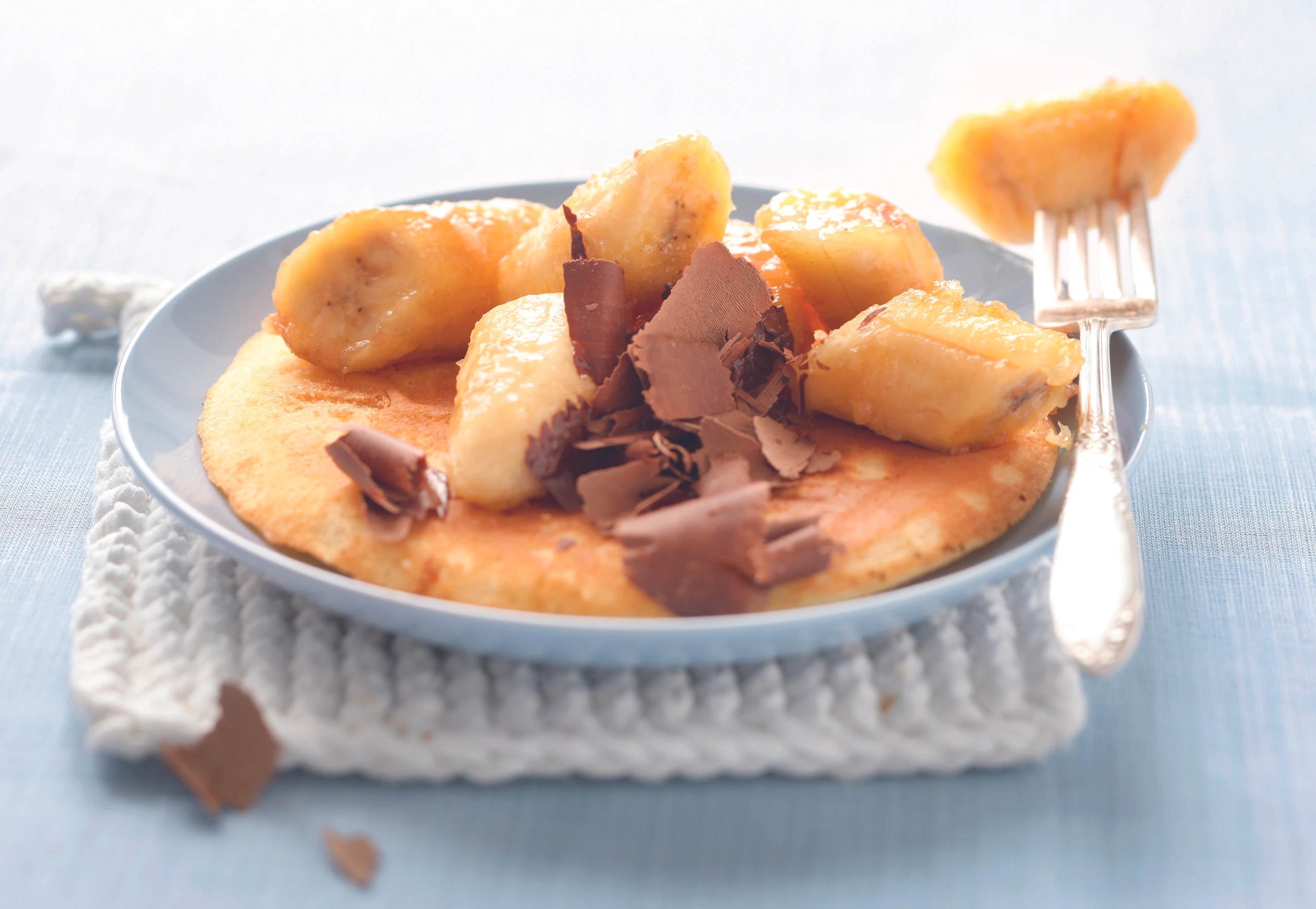 Für die Garnitur Bananen schälen, längs halbieren und quer vierteln. Butter und Kristallzucker in einer Pfanne erhitzen, Bananenstücke darin rundum braten. Waffelkuchen mit Bananen anrichten und eventuell mit Schokospänen garniert servieren.