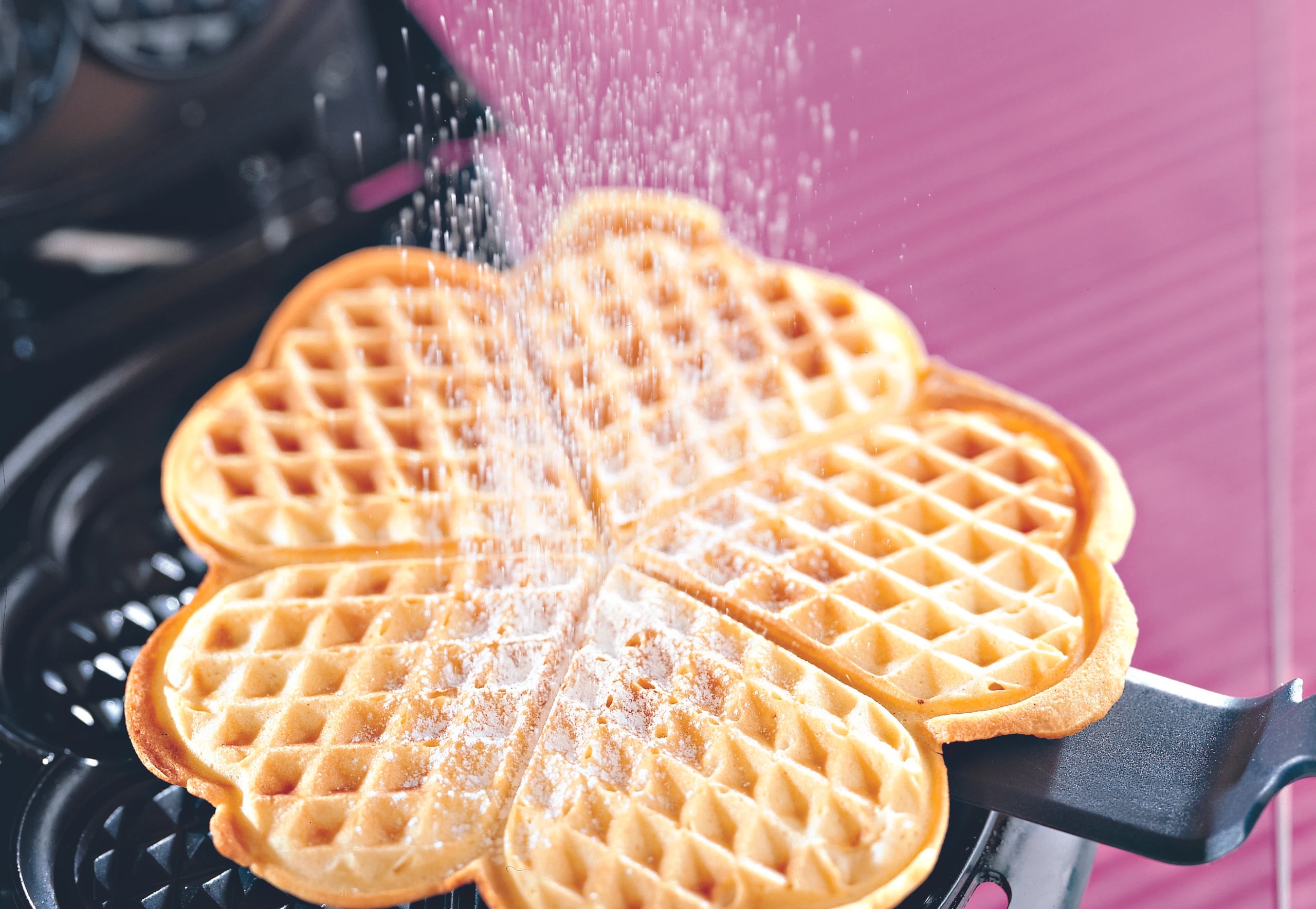 Waffel aus dem Gerät nehmen. Übrigen Teig ebenso verarbeiten. Waffelplatten je nach weiterer Verwendung ganz lassen oder in Herzen schneiden.