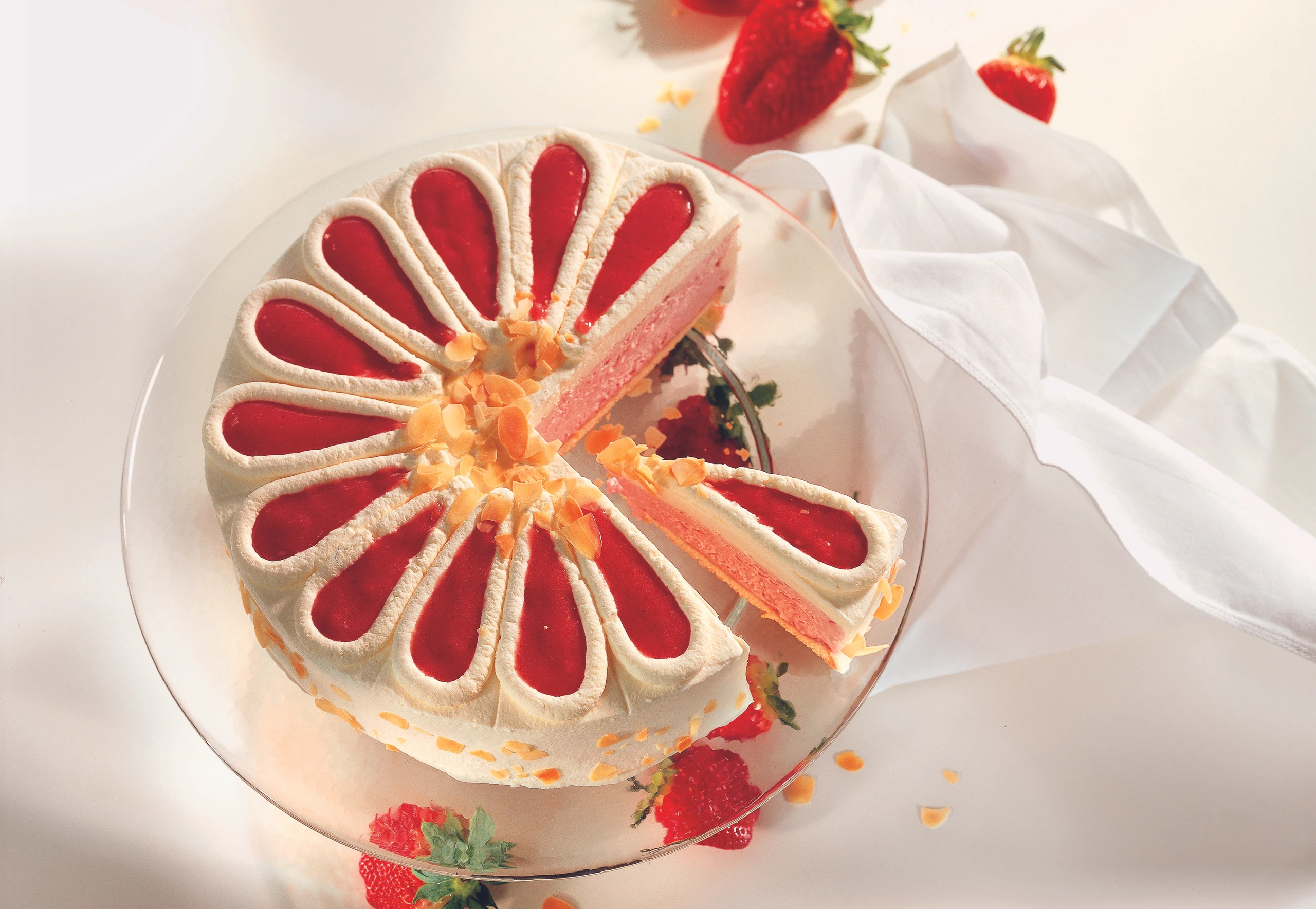Für die Garnitur die Marmelade mit einem Schneebesen gut aufrühren (sie wird dabei etwas heller und dickflüssig) und in ein Papierstanitzel füllen. Obers schlagen. Torte mit zwei Dritteln vom Obers rundum einstreichen, mit einer Palette glatt streichen. Übriges Obers in einen Dressiersack (mit glatter Tülle) füllen und tropfenförmig auf die Torte dressieren. Die Tropfen mit Marmelade ausfüllen. Torte mit Mandelblättchen bestreuen und sofort servieren.
