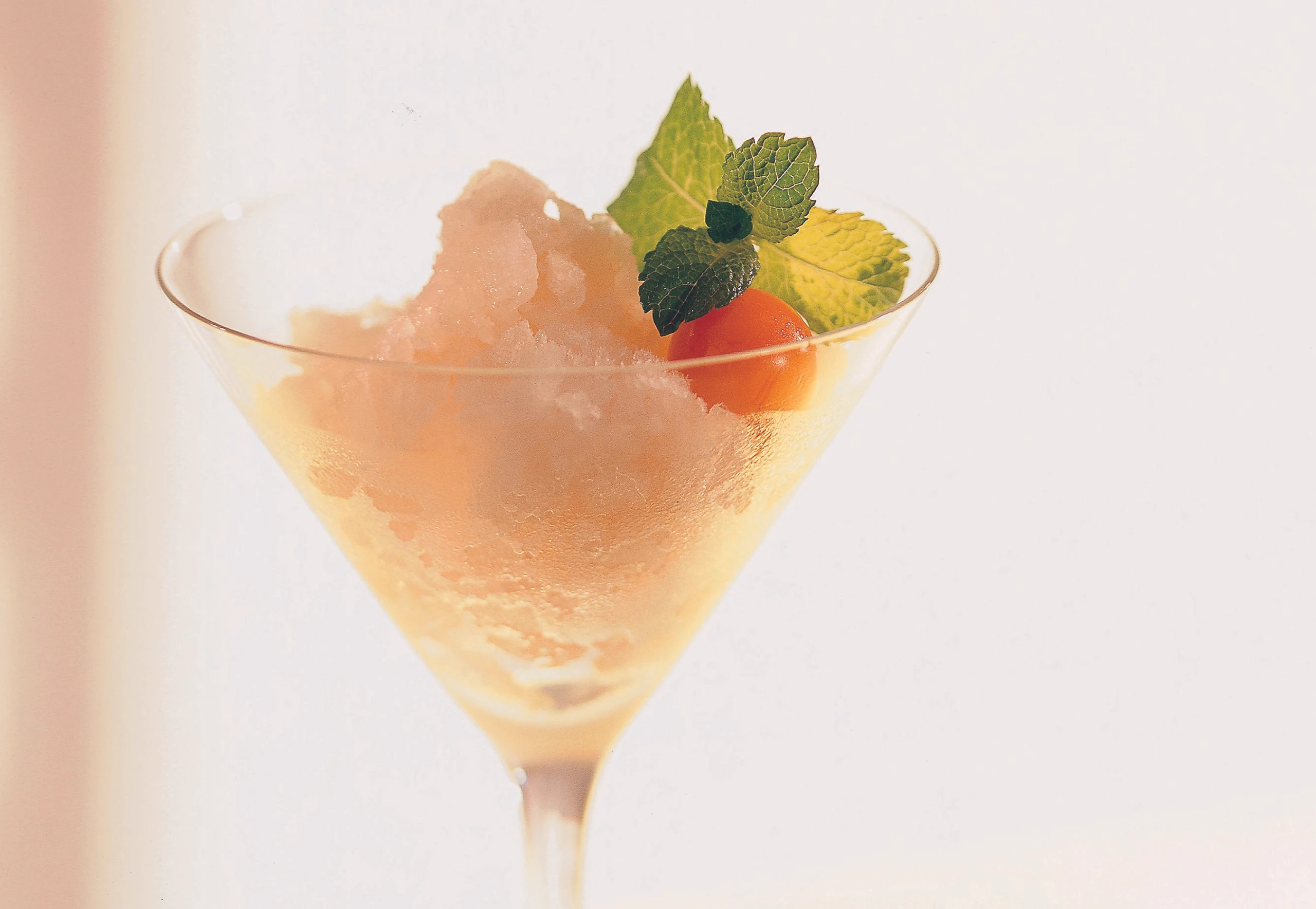 Knapp vor dem Servieren Granité mit einem Löffel abschaben, in die Gläser füllen und mit Erdkirschen und Minzeblättern garnieren.