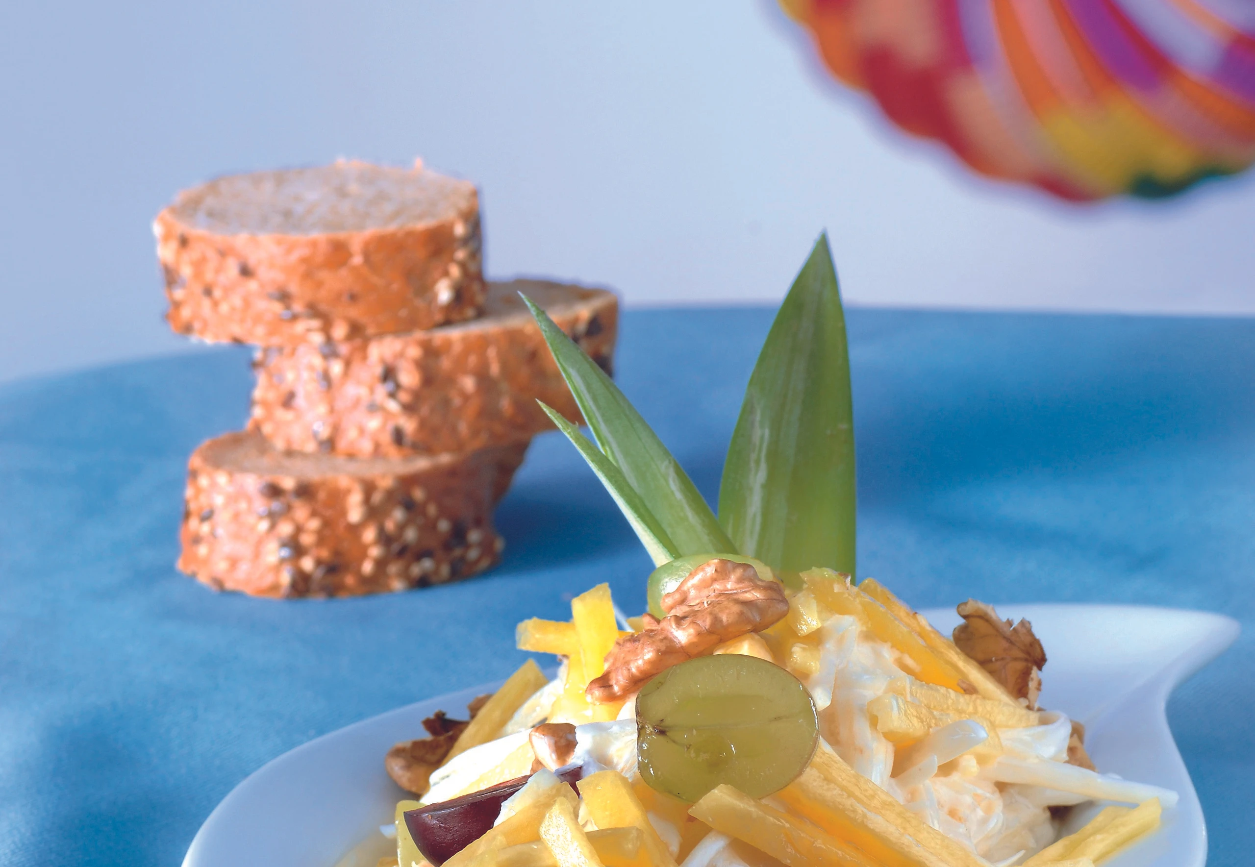 Sellerie schälen und in feine Streifen schneiden (Gemüse-reibe). Ananas schälen, dunkle Vertiefungen und Strunk ausschneiden. Ananas in kleine Würfel schneiden. Ein paar Ananaswürfel und Nüsse für die Garnitur reservieren, übrige Nüsse grob hacken.