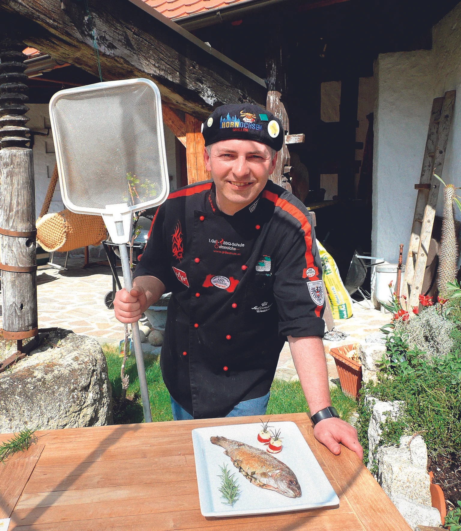 Knoblauch schälen und in Scheiben schneiden. Kräuter und Knoblauchscheiben in die Bauchhöhle der Forellen füllen. Forellen mit Bröseln bestreuen, sofort auf den Rost legen und bei indirekter Hitze (180°–200°C) ca. 25 Minuten grillen.