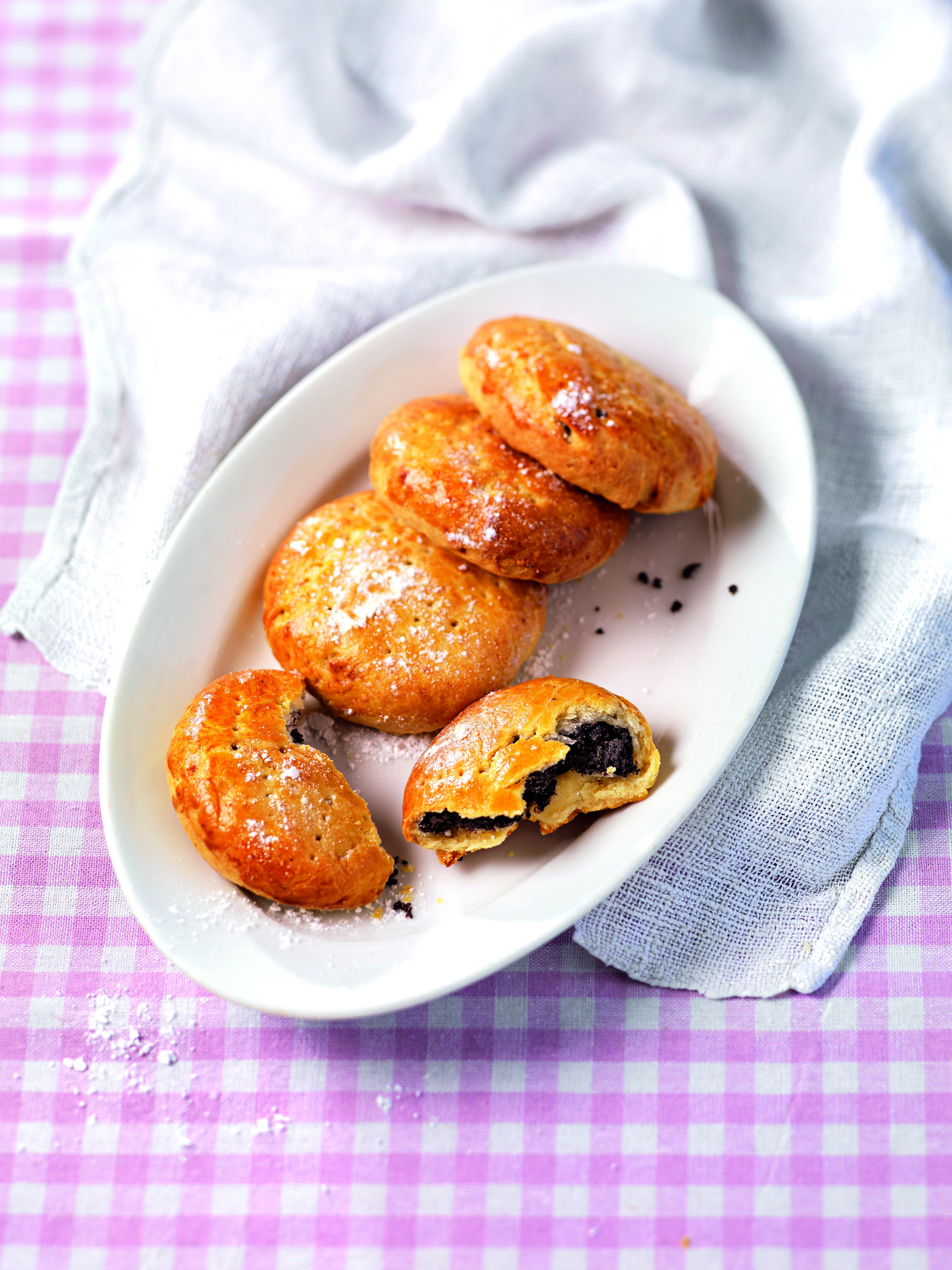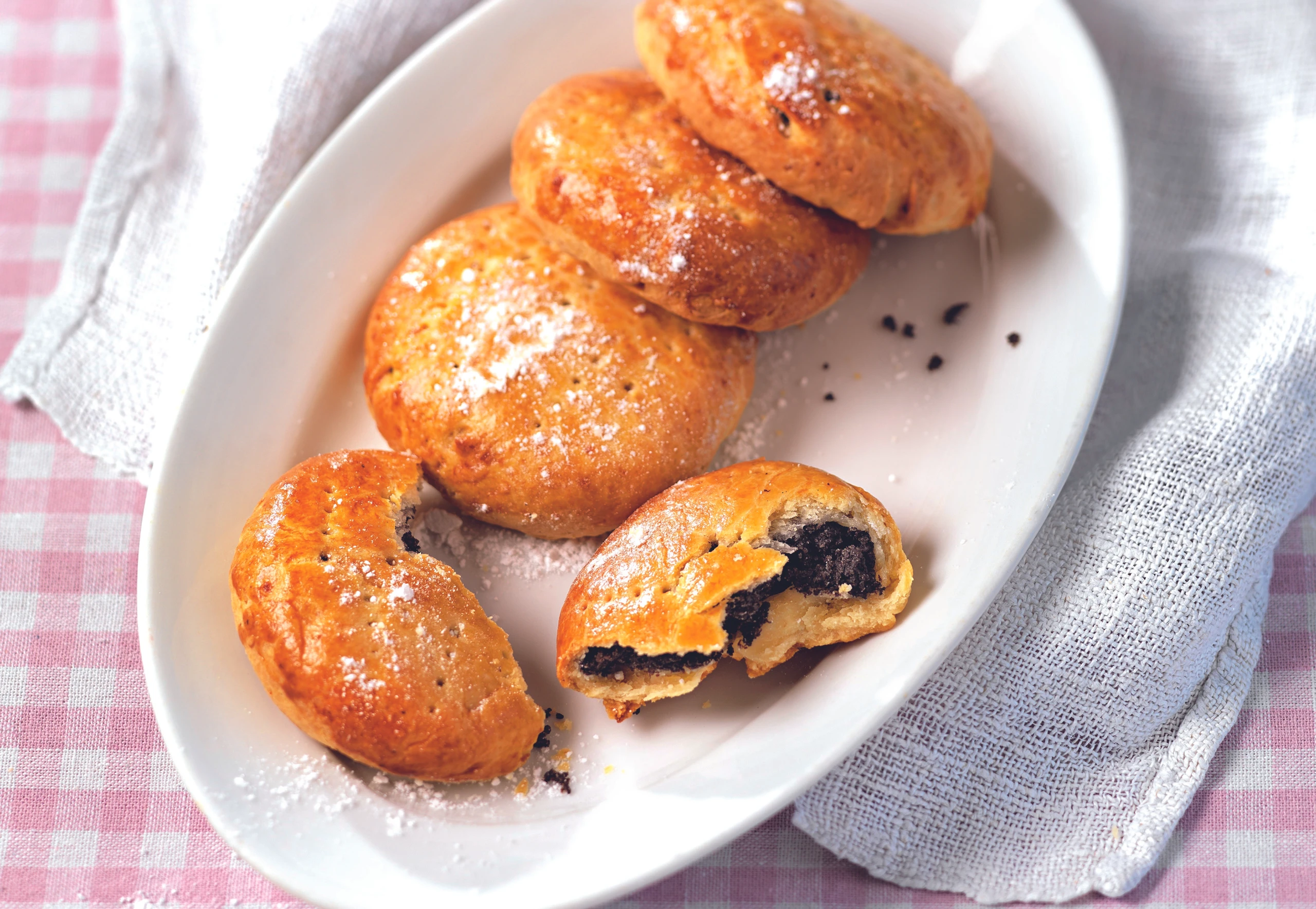 Aus der Fülle 15 Kugeln formen, jede mit einer Teigscheibe umhüllen. Teigkugeln auf ein Blech legen und flach drücken. Mit verquirltem Ei bestreichen, mit einer Gabel mehrmals einstechen, im Rohr 15–20 Minuten goldbraun backen.