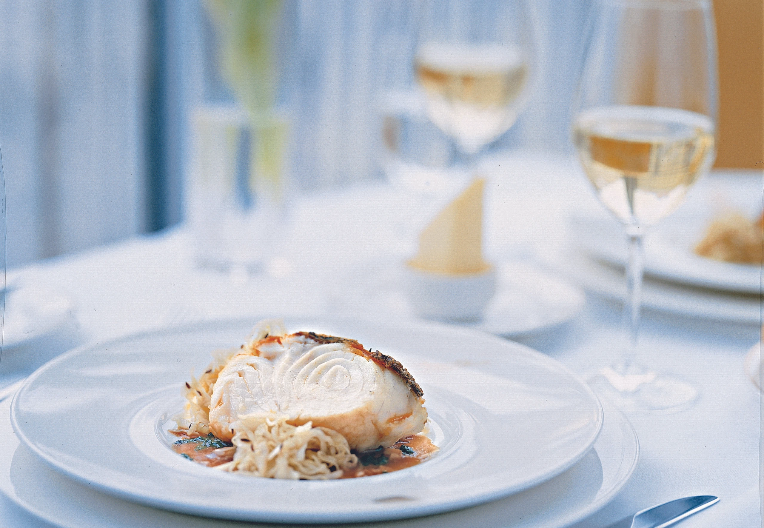 Aus der Pfanne nehmen, auf das Backblech legen und im Rohr fertig ziehen lassen (je nach Filetdicke 10–12 Minuten – der Fisch muss innen noch glasig und ca. 55 °C warm sein). Krautsalat anrichten, Waller darauf setzen und mit dem Saft’l garnieren.
