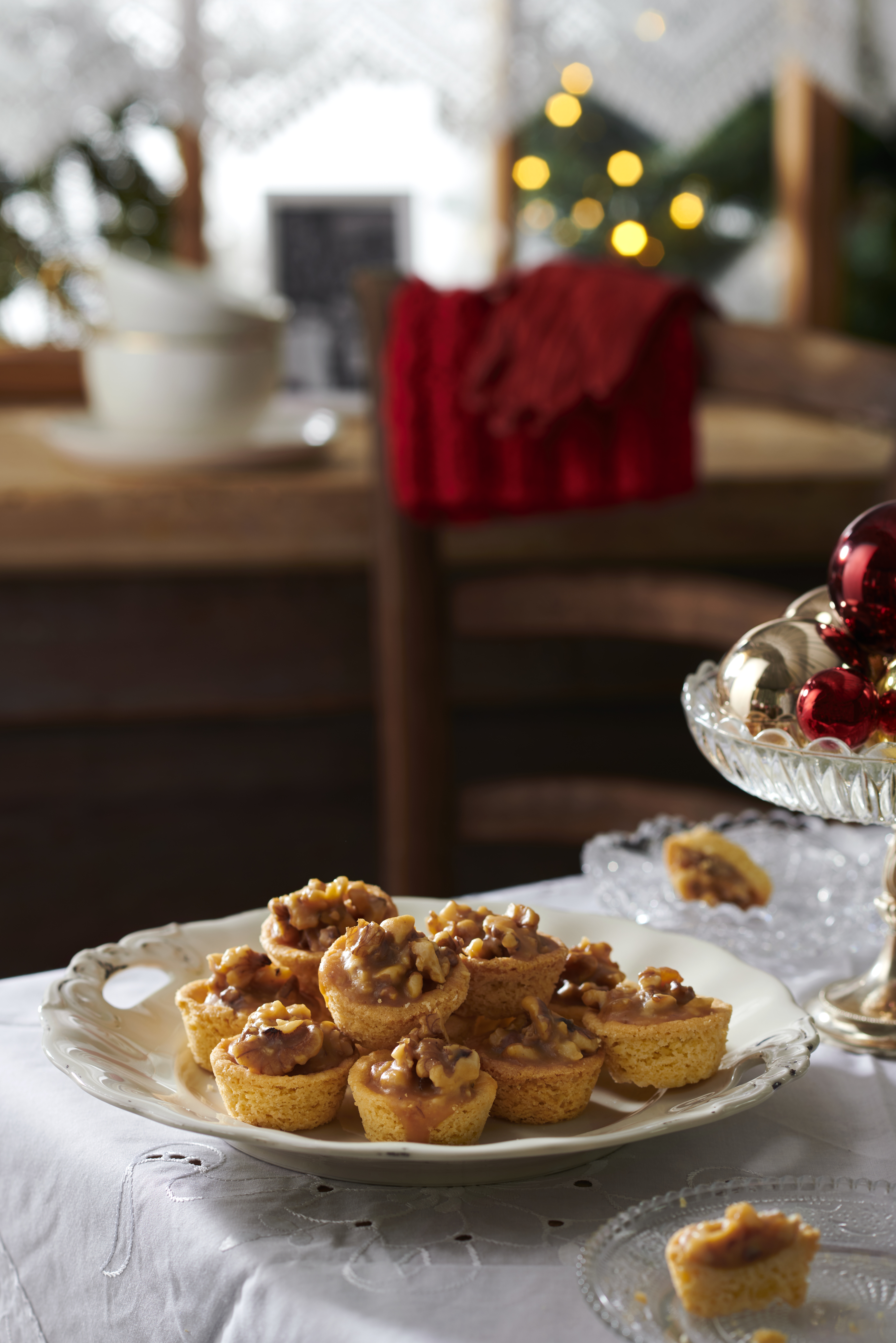 Für die Fülle Obers erwärmen. Glukose und Zucker aufkochen, bis ein Karamell entsteht. Obers und Butter zugeben und ca. 5 Minuten köcheln lassen. Walnüsse untermischen.