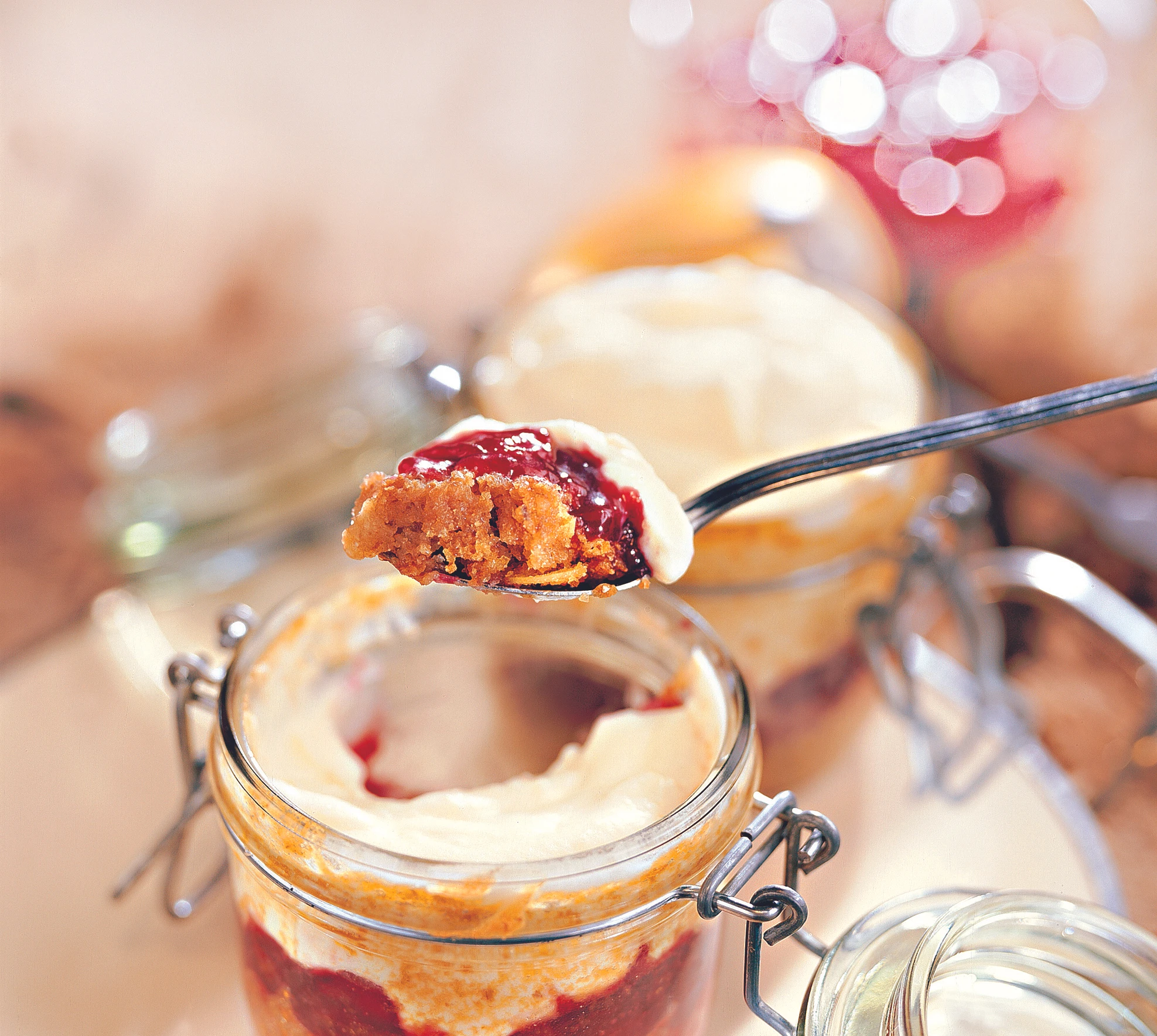 Gläser herausnehmen, Kuchen kurz überkühlen lassen. Marmelade in den Gläsern verteilen, Kuchen im Glas auskühlen lassen.