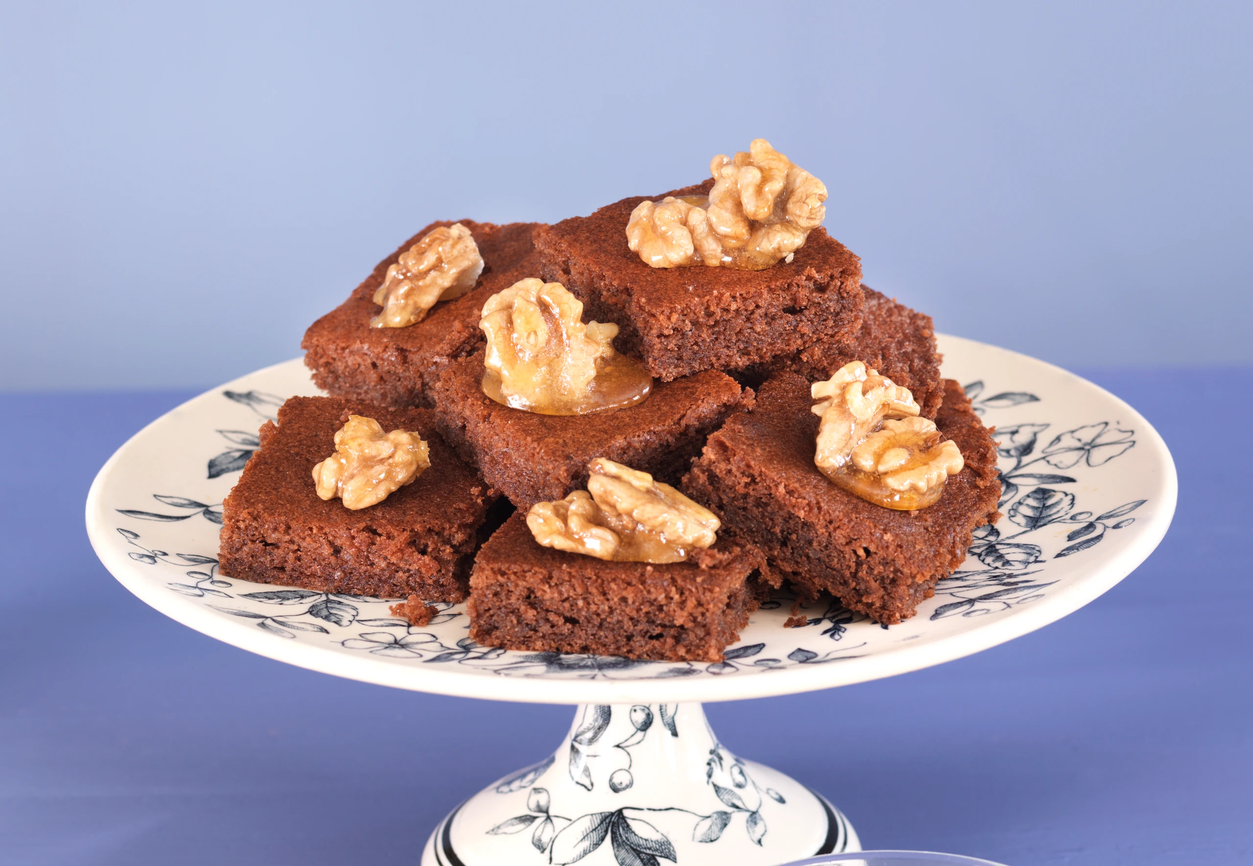 Für die Garnitur Silikonmatte oder Backpapier und 2 kleine Löffel vorbereiten. Restlichen Kristallzucker und Wasser unter Rühren aufkochen, dann schwenken, bis der Zucker karamellfarben ist. Walnüsse zugeben und durchrühren. Mit Hilfe der Löffel 25 Häufchen auf die Matte oder das Papier geben und fest werden lassen.