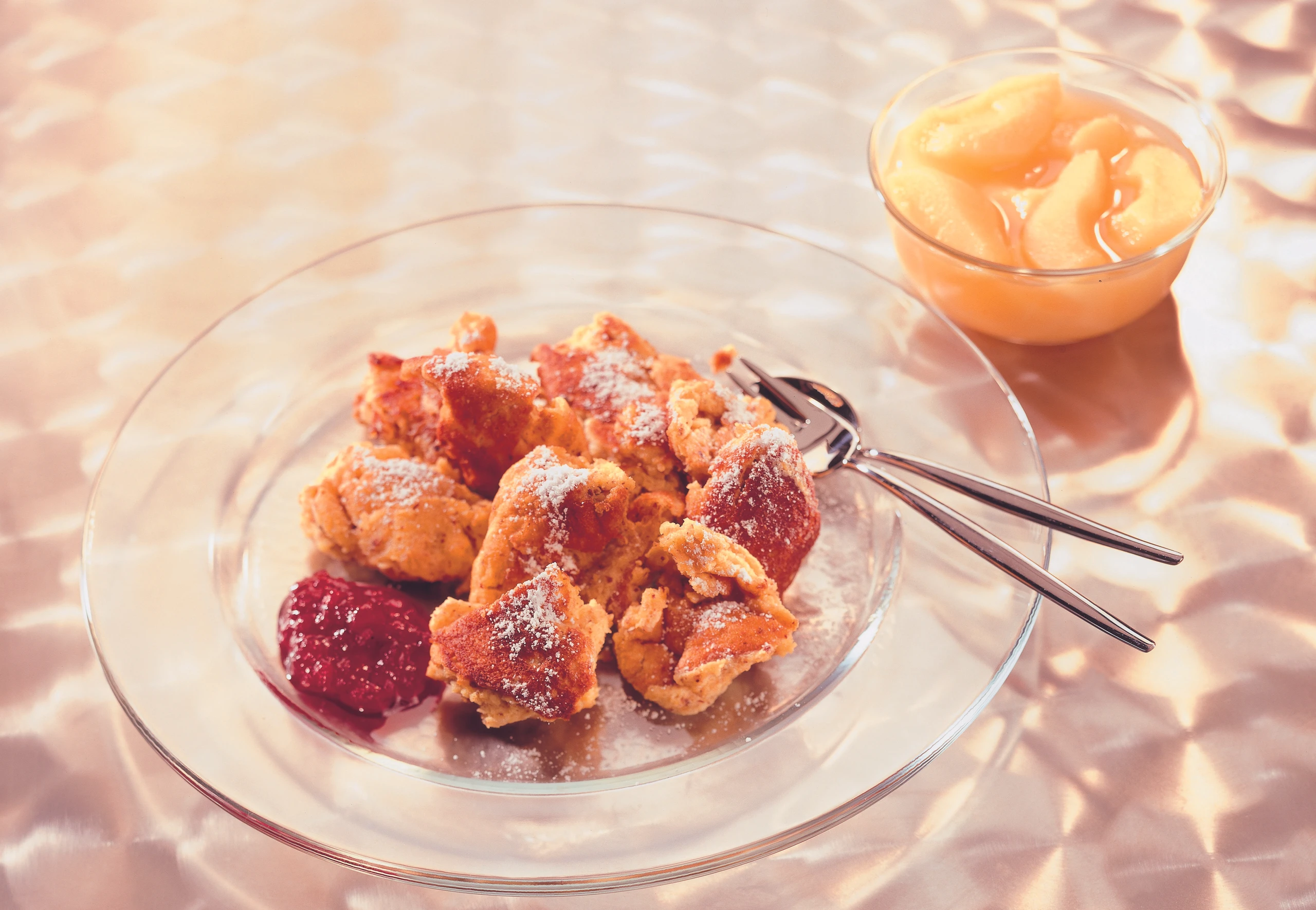 - Pfanne auf den Herd stellen, die Masse wenden und backen, bis die Unterseite goldgelb gebräunt ist. Schmarren mit zwei Kochlöffeln zerpflücken, mit Staubzucker oder Streusüße bestreut anrichten. Dazu passen Birnen- und Preiselbeer-Kompott.