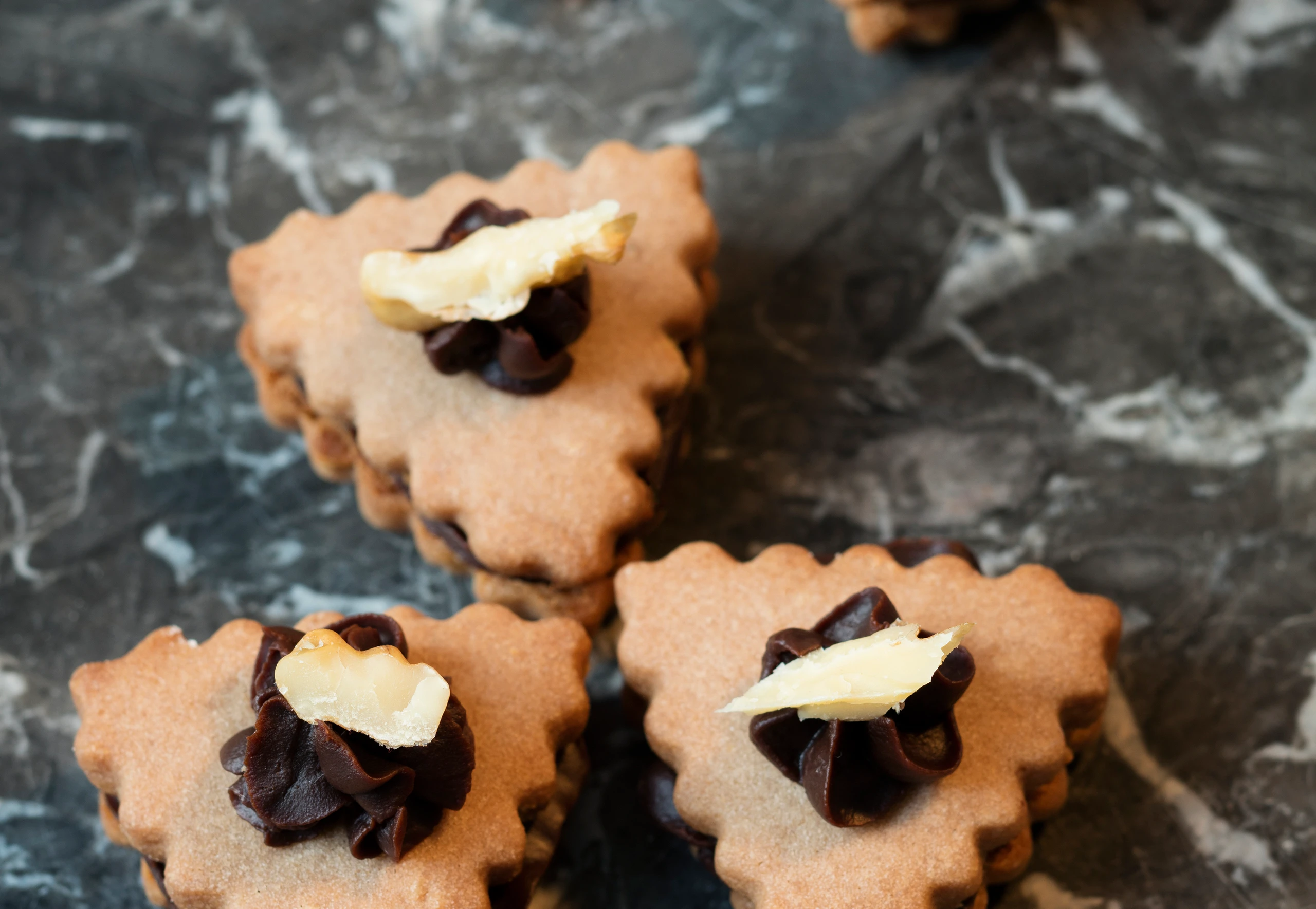 Je 2 Kekse mit Ganache zusammensetzen, einen Tupfer Ganache obenauf setzten und mit einem Walnussstück verzieren.