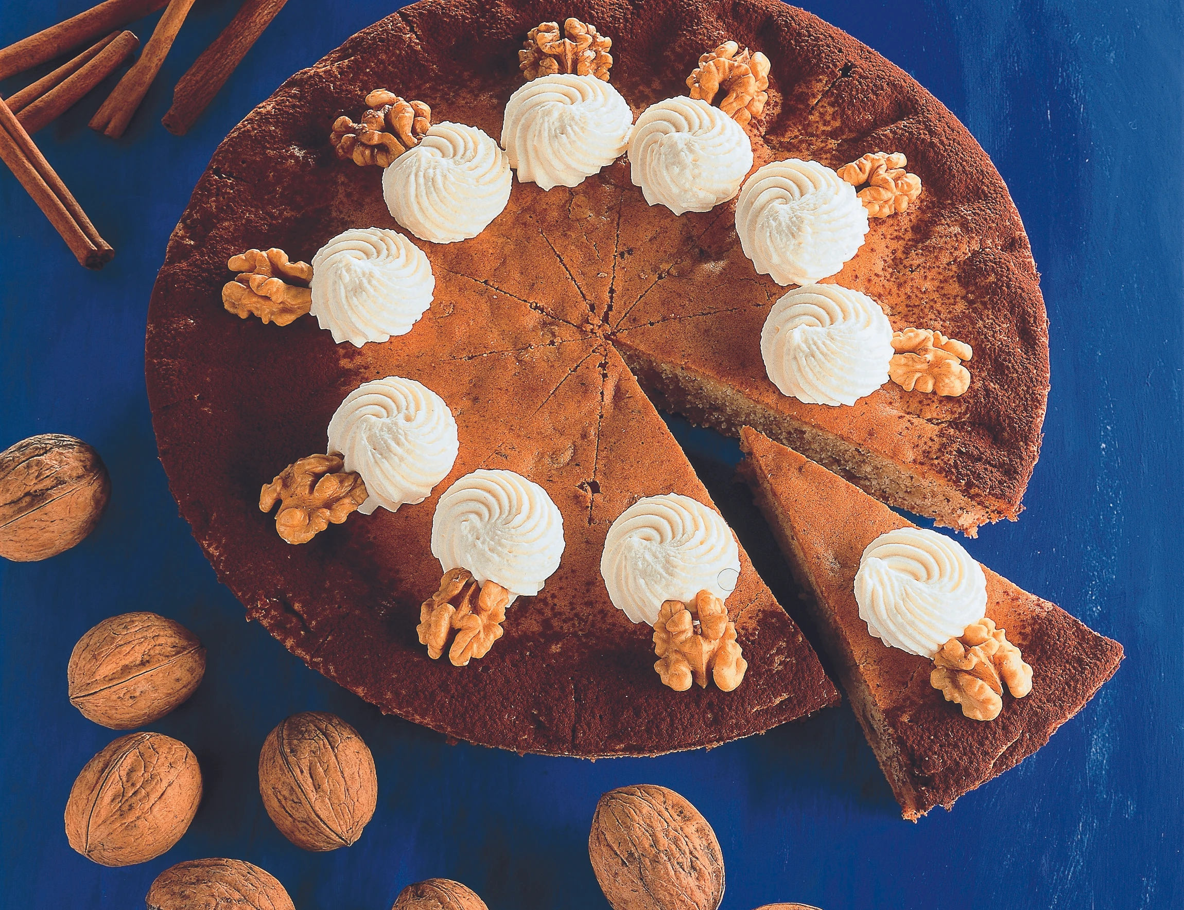 Obers mit Zucker aufschlagen. Tarte aus der Form heben, mit Kakao bestreuen, mit Obers und halben Walnusskernen garnieren.