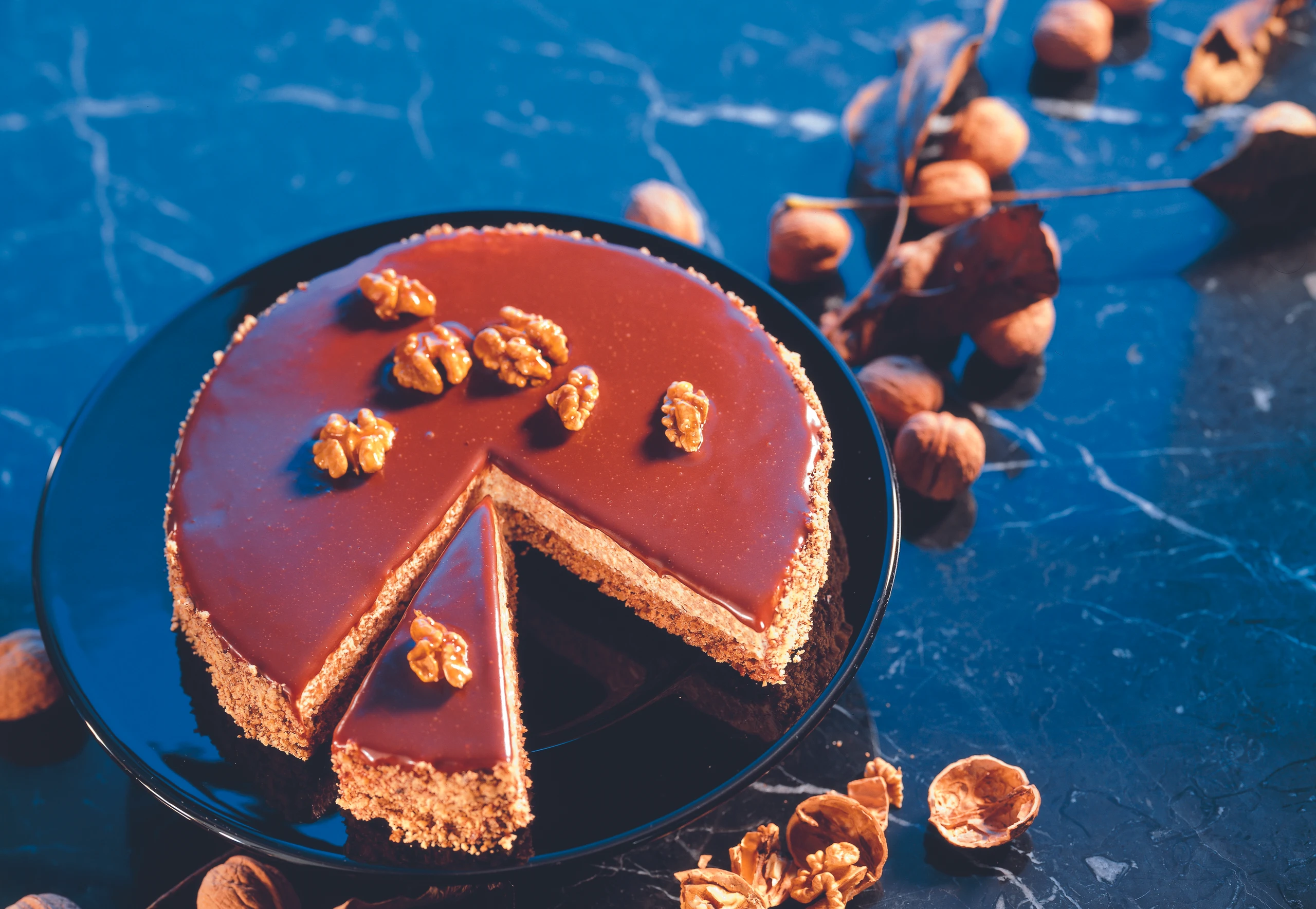 Folie von der Torte entfernen und die Torte aus der Form nehmen. Glasur über die Torte gießen und gleichmäßig verstreichen. Seitenränder mit Walnüssen bestreuen. Torte zum Anziehen der Glasur ca. 1 Stunde kühlen.