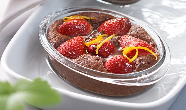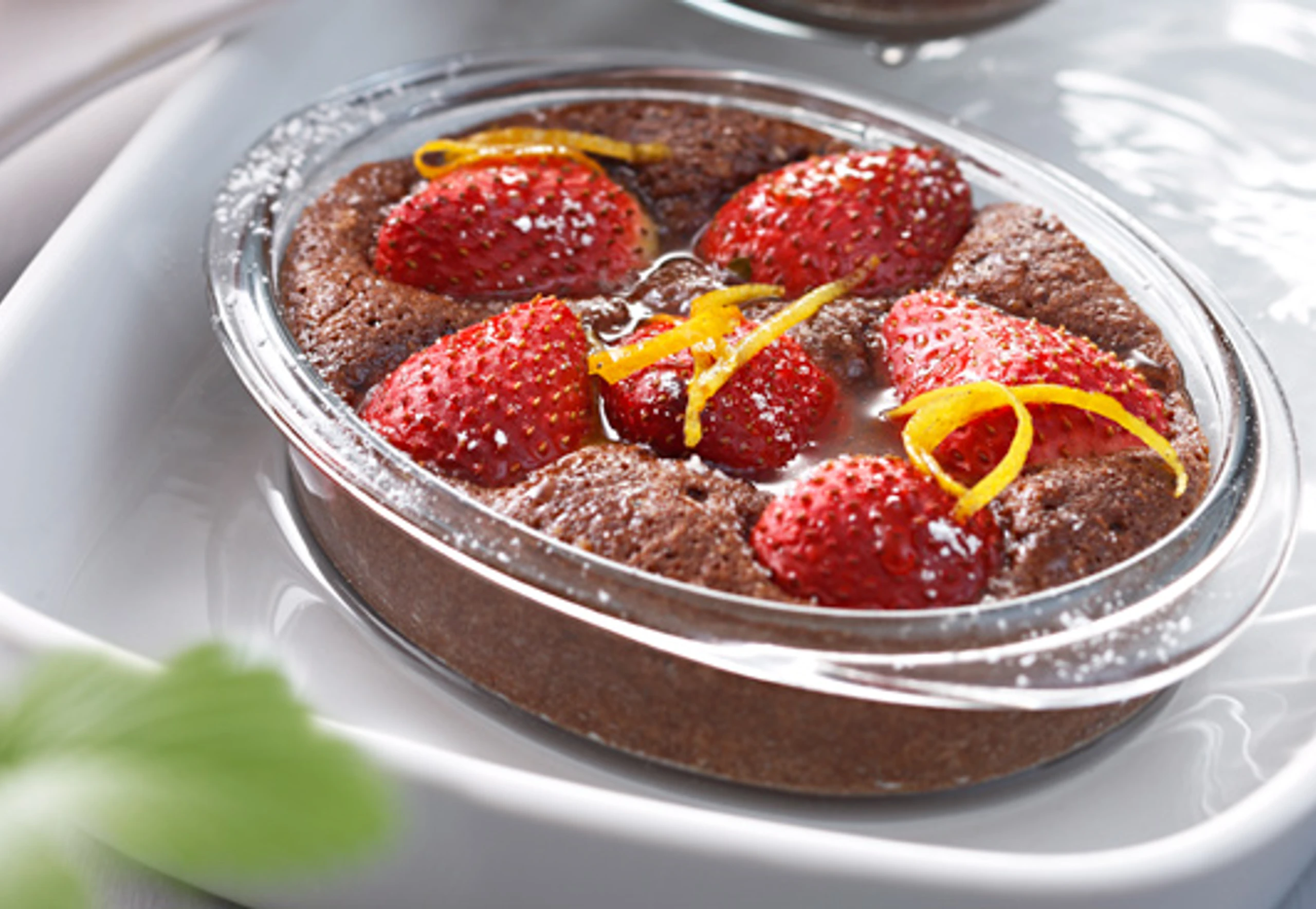 Erdbeeren putzen. Butter bei schwacher Hitze bräunen und vom Herd nehmen. Mehl, Mandeln, Staubzucker und 1 Prise Salz vermischen. Eiklar zu Schnee schlagen. Kuvertüre über Wasserdampf schmelzen und mit der Butter verrühren. Schnee und Mehlmischung unterheben. Masse gleichmäßig in den Förmchen verteilen. Erdbeeren behutsam in die Masse drücken. Aufläufe ins Wasserbad stellen und im Rohr ca. 20 Minuten backen.