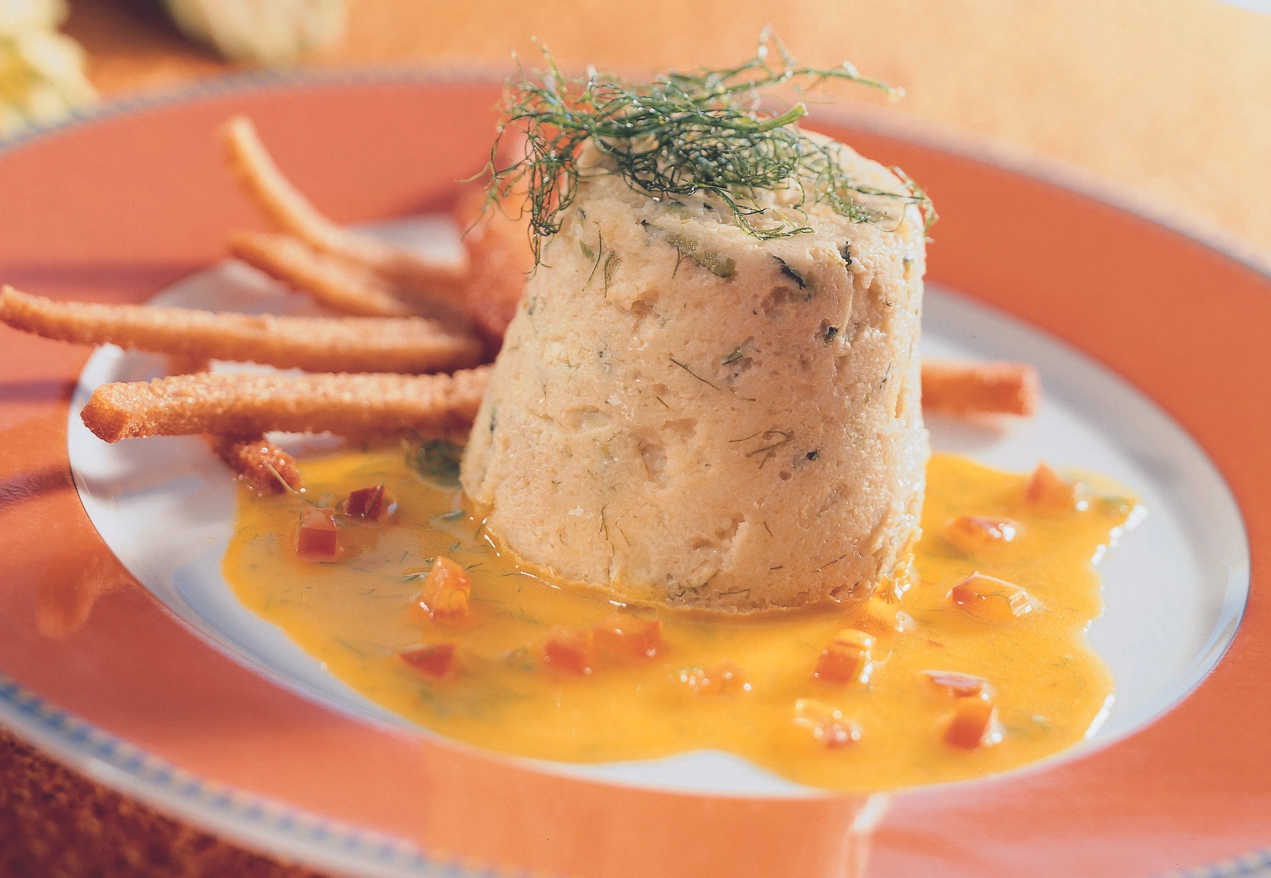 Ei, Fenchelpüree, Zucchini, Wermut, Fenchelgrün, Salz und Pfeffer in die Grießmasse rühren, Masse in die Förmchen füllen.