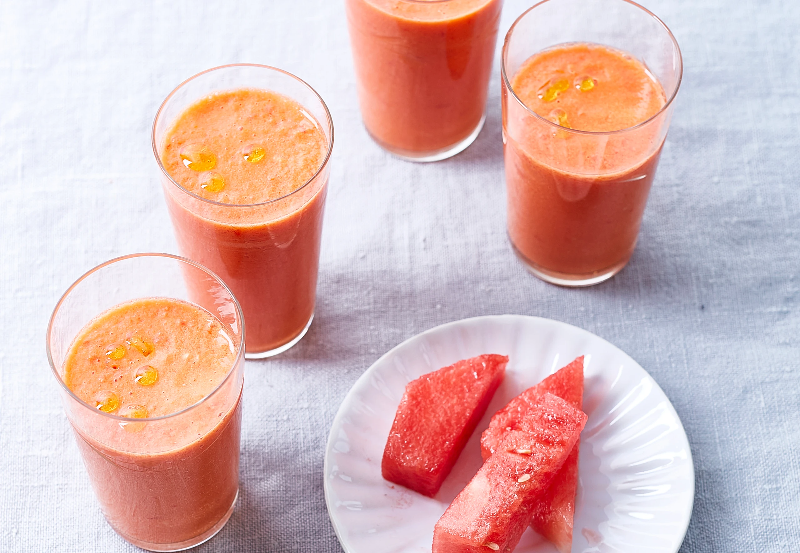 Paprika-, Paradeiser- und Melonenstücke in den Blender geben. 8 EL vom Olivenöl, 1 gute Prise Salz und Pfeffer dazu geben und alles fein mixen. (Wer Gazpacho lieber dünner mag, fügt etwas eiskaltes Wasser hinzu.) Gazpacho für ca. 1 Stunde in den Kühlschrank stellen.