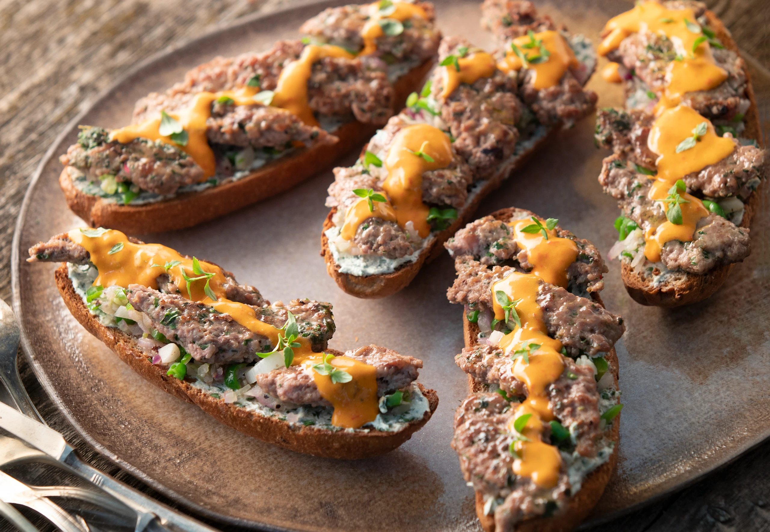 Rohr auf Grillstellung vorheizen. Weckerln längs halbieren, mit den Schnittflächen nach oben auf das Backblech legen und im Rohr (mittlere Schiene) toasten. Weckerlhälften mit der Knoblauchcreme bestreichen und mit Faschiertem belegen. Darauf die Zwiebelmischung verteilen, Weckerln mit der Sauce garnieren und eventuell mit Kräutern bestreuen.