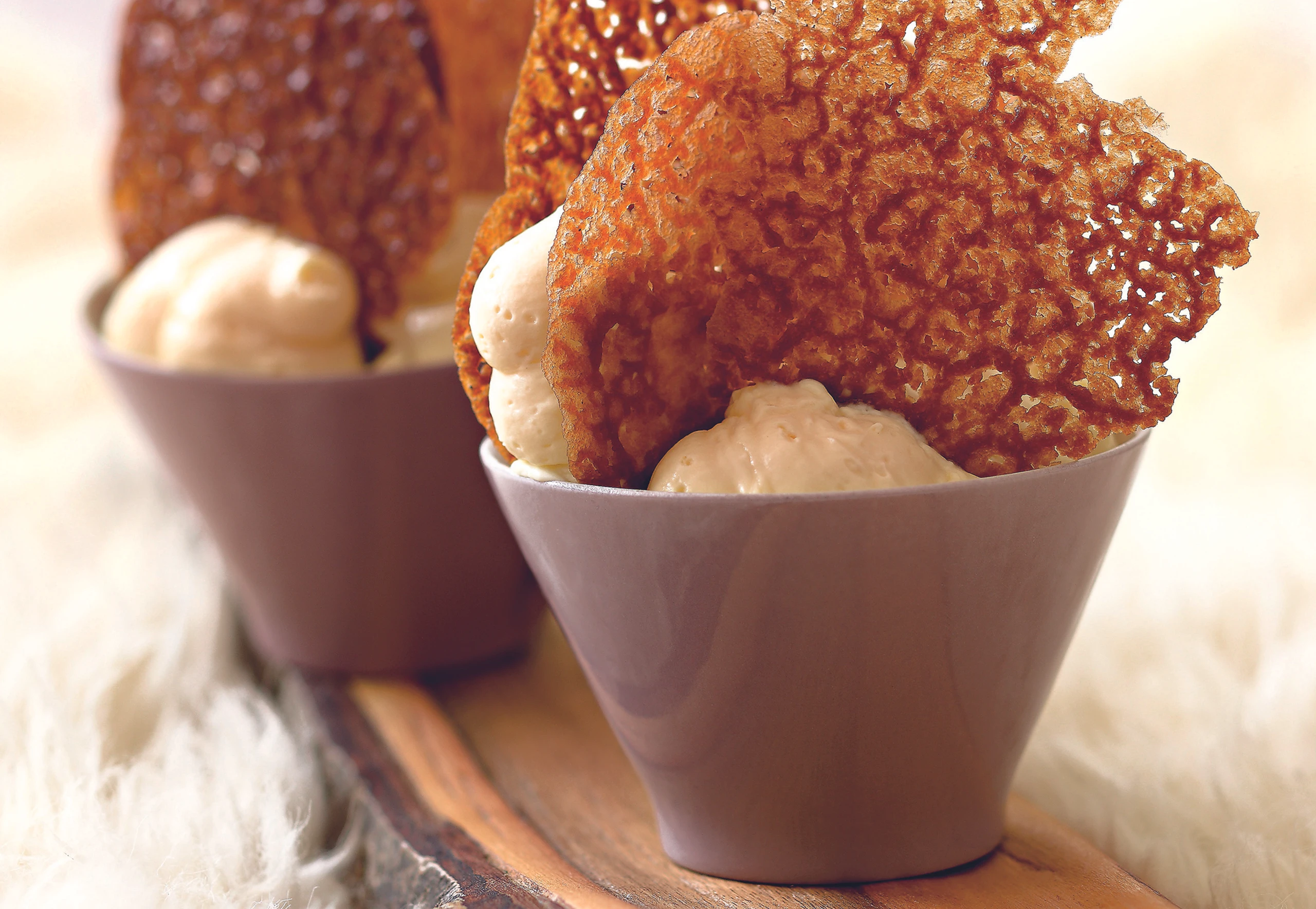 Mousse in einen Dressiersack mit glatter Tülle füllen. Mousse in Schüsserln dressieren und mit den Kakao-Blättern dekorieren.