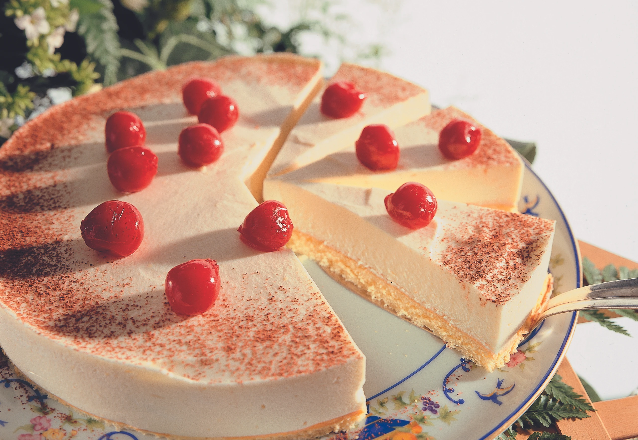 Springform öffnen, den Ring abheben und die Folie vorsichtig entfernen. Torte mit Kakao bestreuen und mit den Kirschen dekorieren.