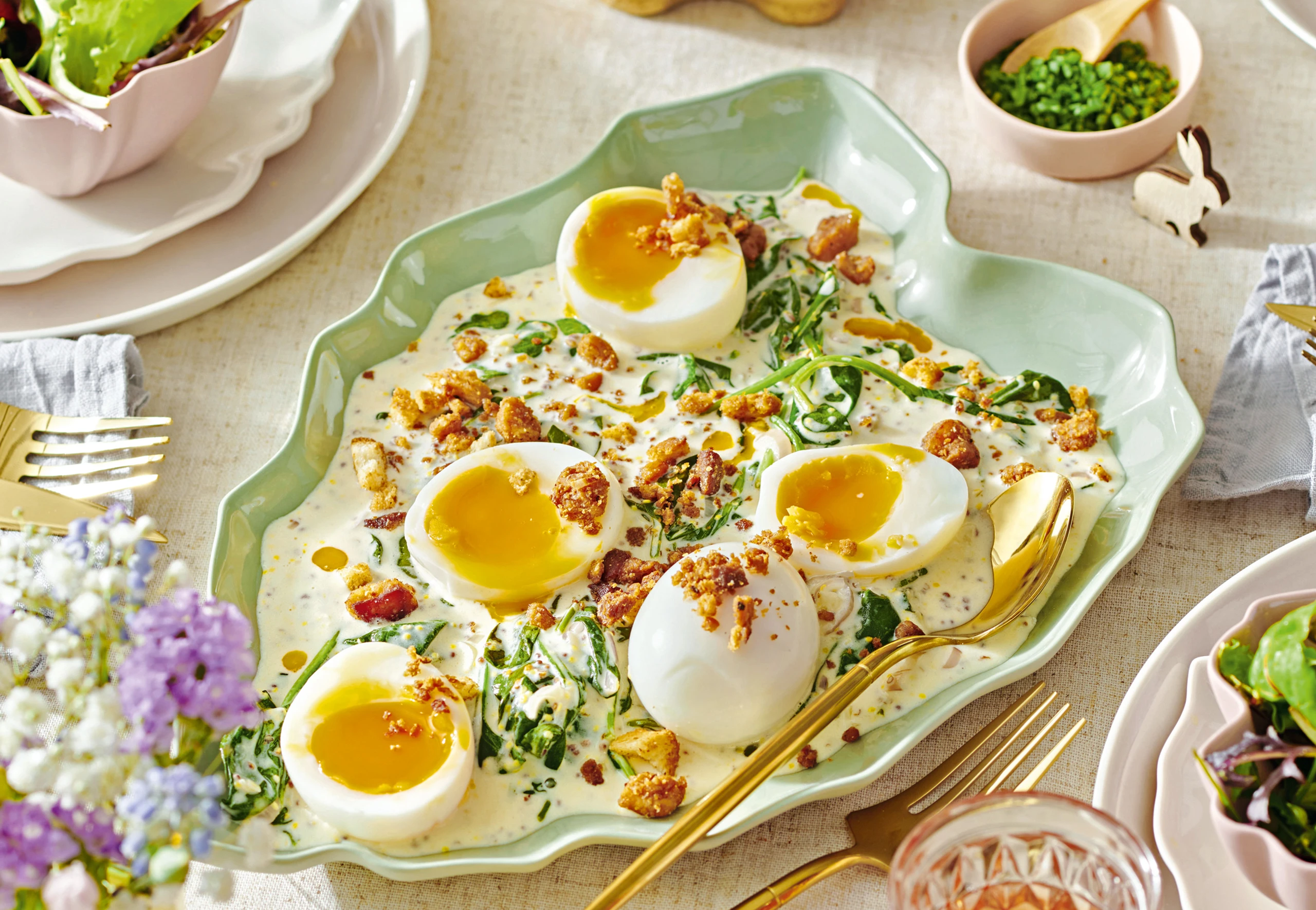 Eier halbieren und in die Sauce legen. Mit den Grammel-Streuseln bestreuen.