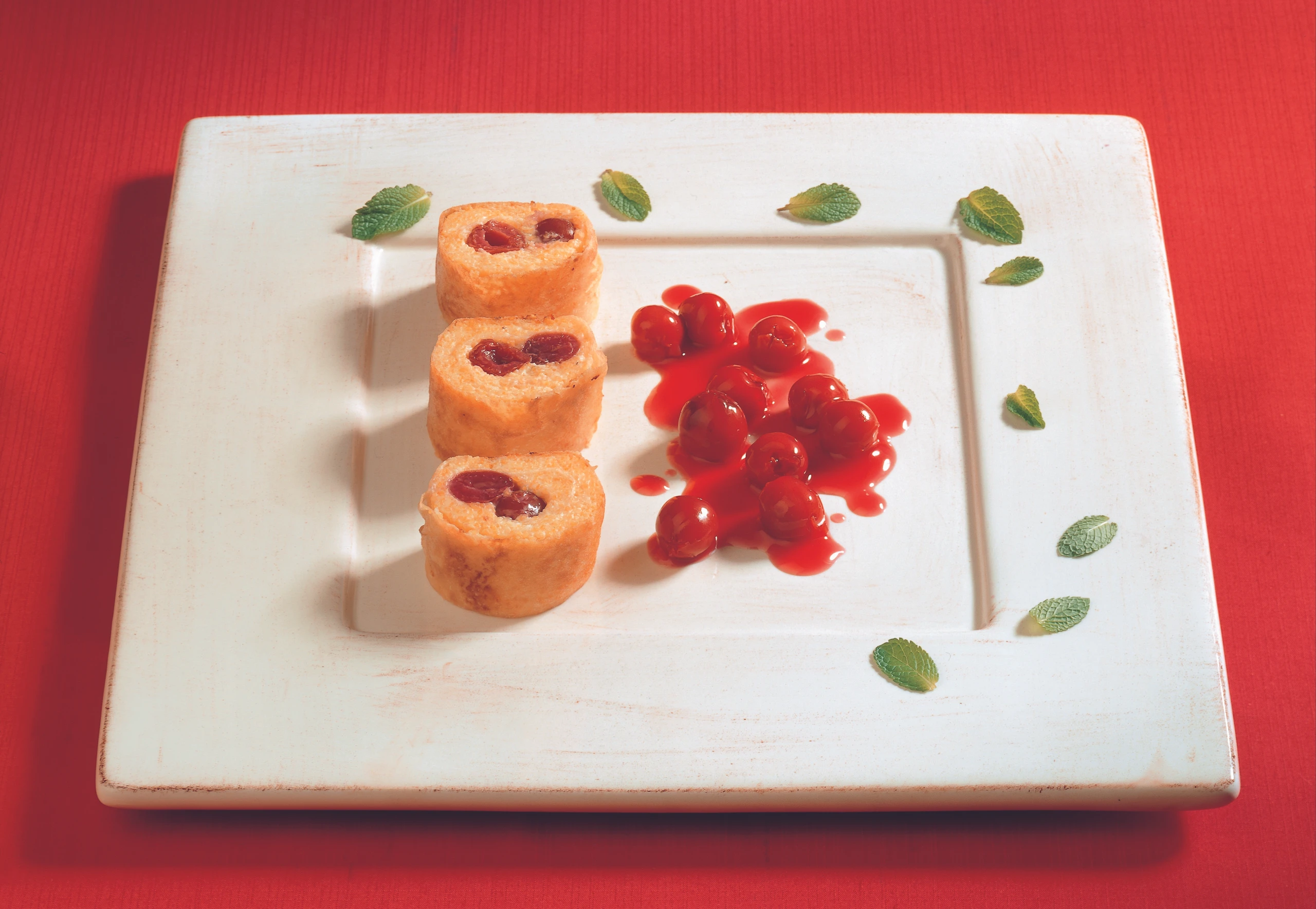 Öl in einem schmalen Topf (Ø ca. 18 cm) erhitzen. Die beiden Strudelrollen darin nacheinander goldgelb backen, herausheben und auf Küchenpapier gut abtropfen lassen. Die Strudelrollen in Scheiben schneiden, mit der Weichselsauce (siehe Rezept) und Minzeblättern garniert servieren.
