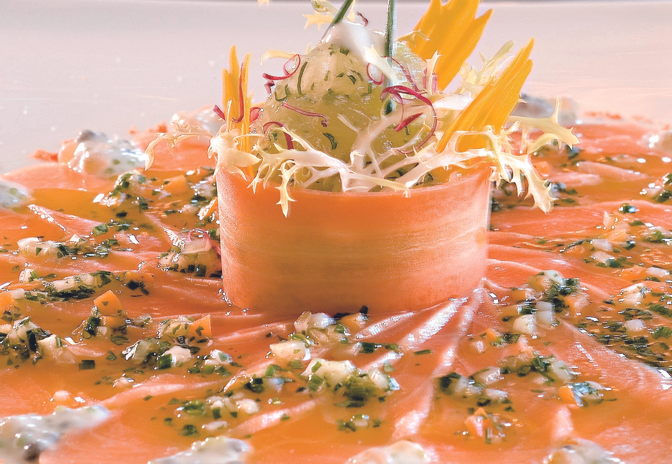 Lachsfilet in dünne Scheiben schneiden, fächerförmig anrichten, mit Vinaigrette beträufeln, mit Kaviar-Rahm und Schmorgurken anrichten.