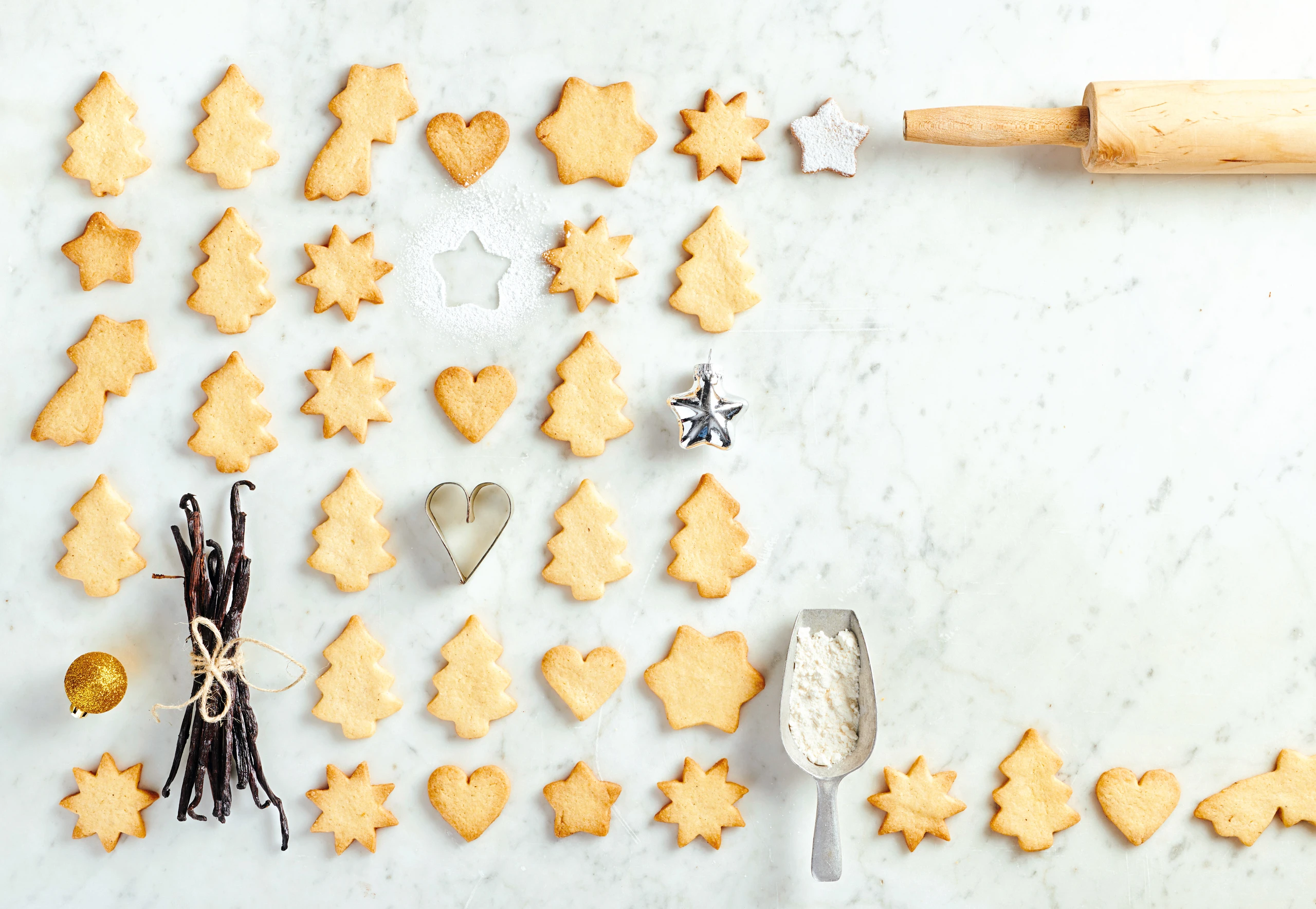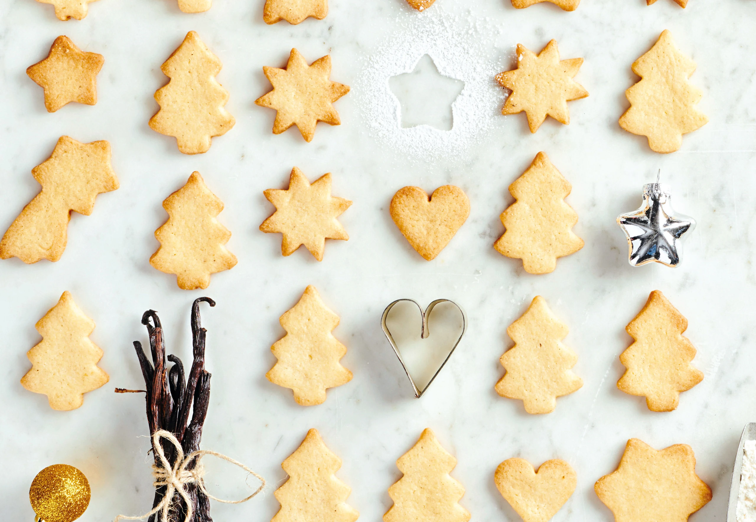 Teig kurz verkneten und auf einer leicht bemehlten Arbeitsfläche ca. 4 mm dick ausrollen. Kekse ausstechen, auf die Bleche legen und nacheinander im Rohr (mittlere Schiene) ca. 12 Minuten hell backen.