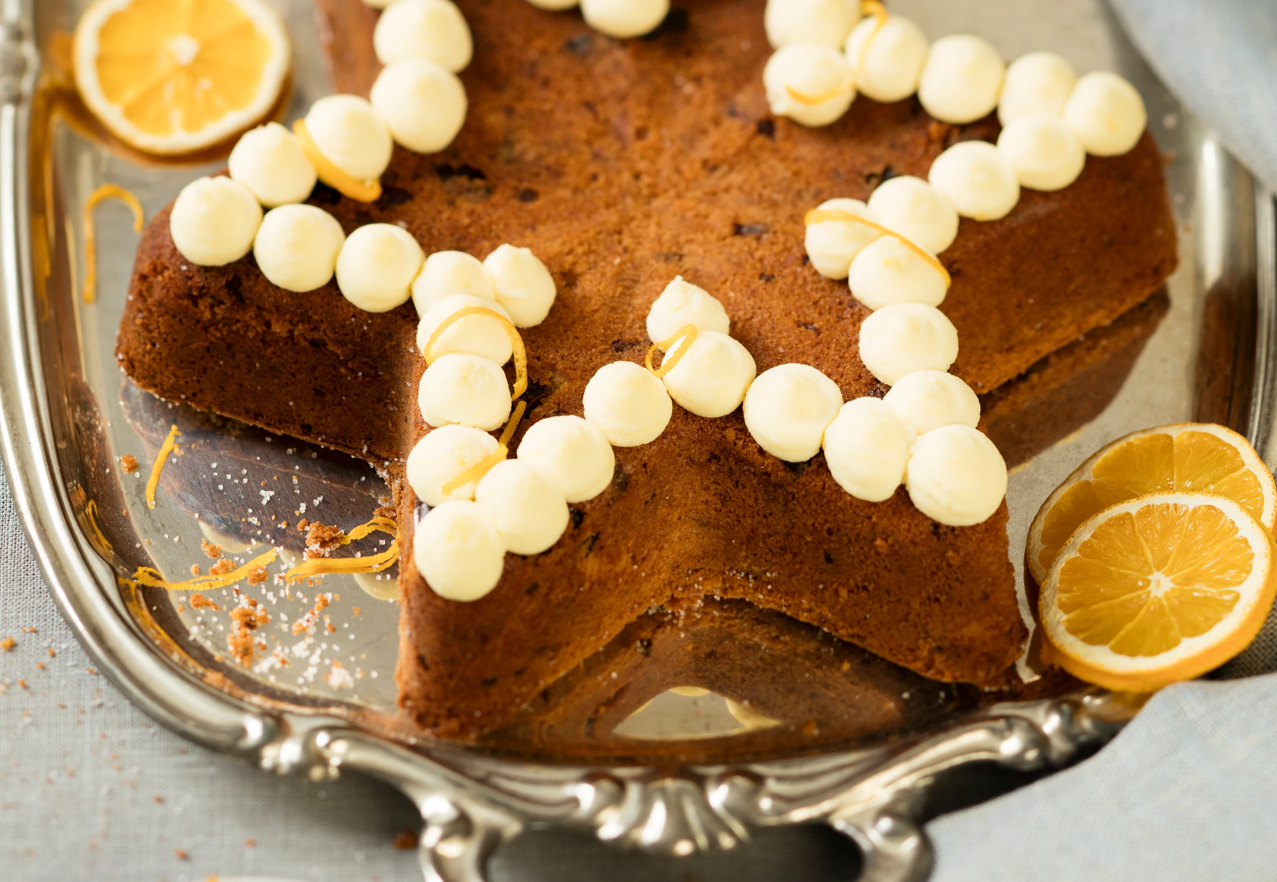 Für die Creme Mascarpone und Schlagobers mit Staubzucker und Orangenschale leicht cremig aufschlagen und in einen Dressiersack (glatte Tülle Nr. 8) füllen. Creme in Tupfen auf den Kuchen dressieren, mit Zesten garnieren.