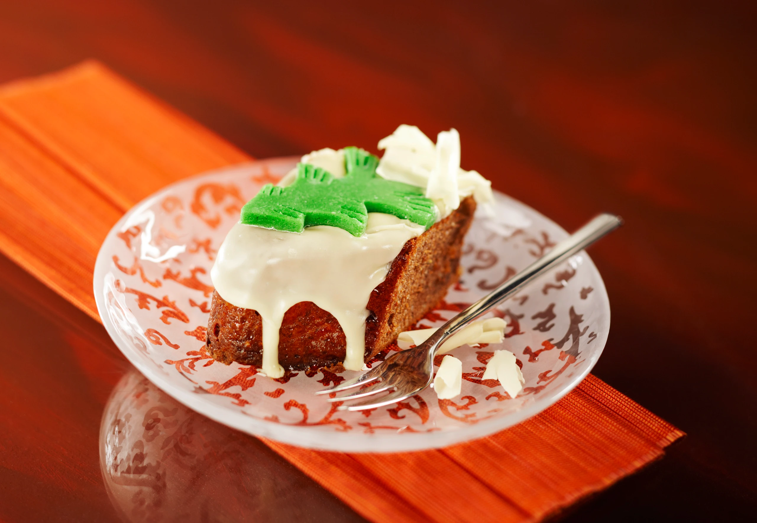 Marmelade erwärmen, Kuchen damit bestreichen. Für die Glasur 150 g von der Kuvertüre in Stücke brechen. Wasser und Zucker aufkochen, Kuvertüre darin auflösen. Mischung mit dem Schneebesen aufschlagen und auf ca. 35°C abkühlen lassen. Glasur auf den Kuchen gießen und verlaufen lassen. Restliche Kuvertüre raspeln. Kuchen mit Marzipanbäumchen und Kuvertüre garnieren und zum Festwerden der Glasur für ca. 1 Stunde kühl stellen.