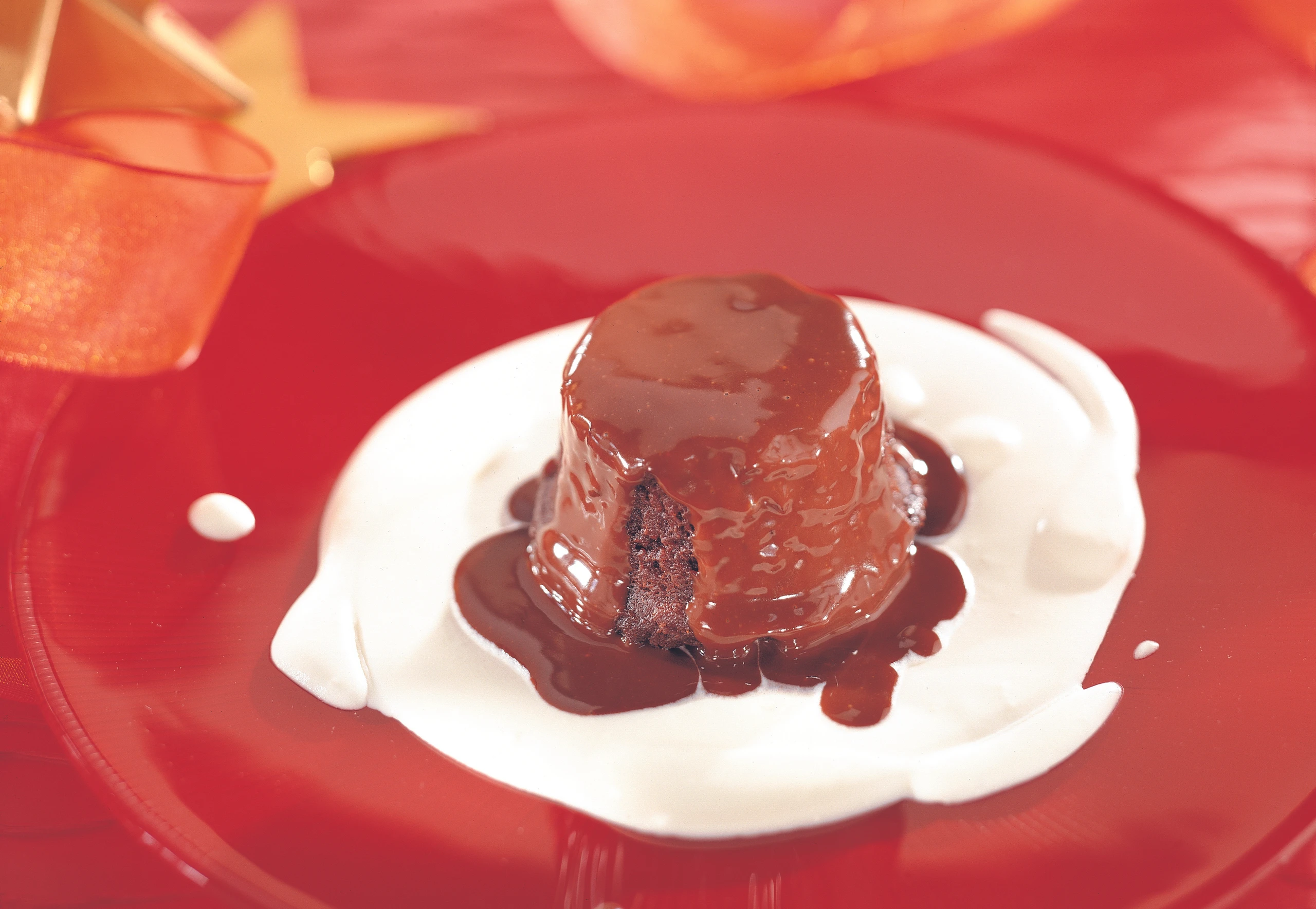 Für die Garnitur Obers halbfest schlagen und auf Tellern verteilen. Puddings darauf anrichten. Mit Rum-Schoko-Sauce dekorieren.