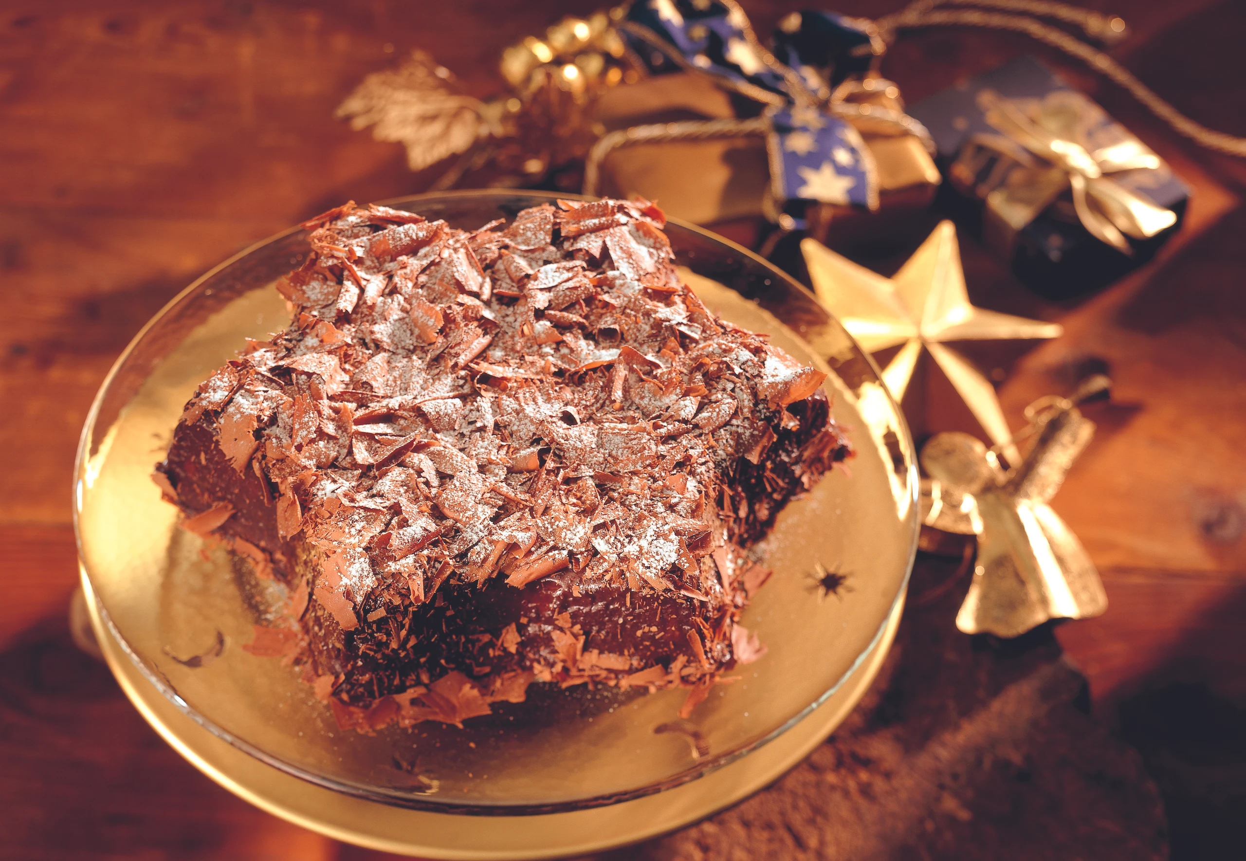 Stern einmal durchschneiden. Die Hälfte der Creme auf der unteren Hälfte des Sterns verstreichen, obere Sternhälfte darauf legen und behutsam andrücken. Oberfläche und Ränder des Sterns mit der übrigen Creme bestreichen und mit der geraspelten Schokolade bestreuen. Stern ca. 2 Stunden kühl stellen. Weihnachts-Stern vor dem Servieren mit wenig Staubzucker bestreuen.