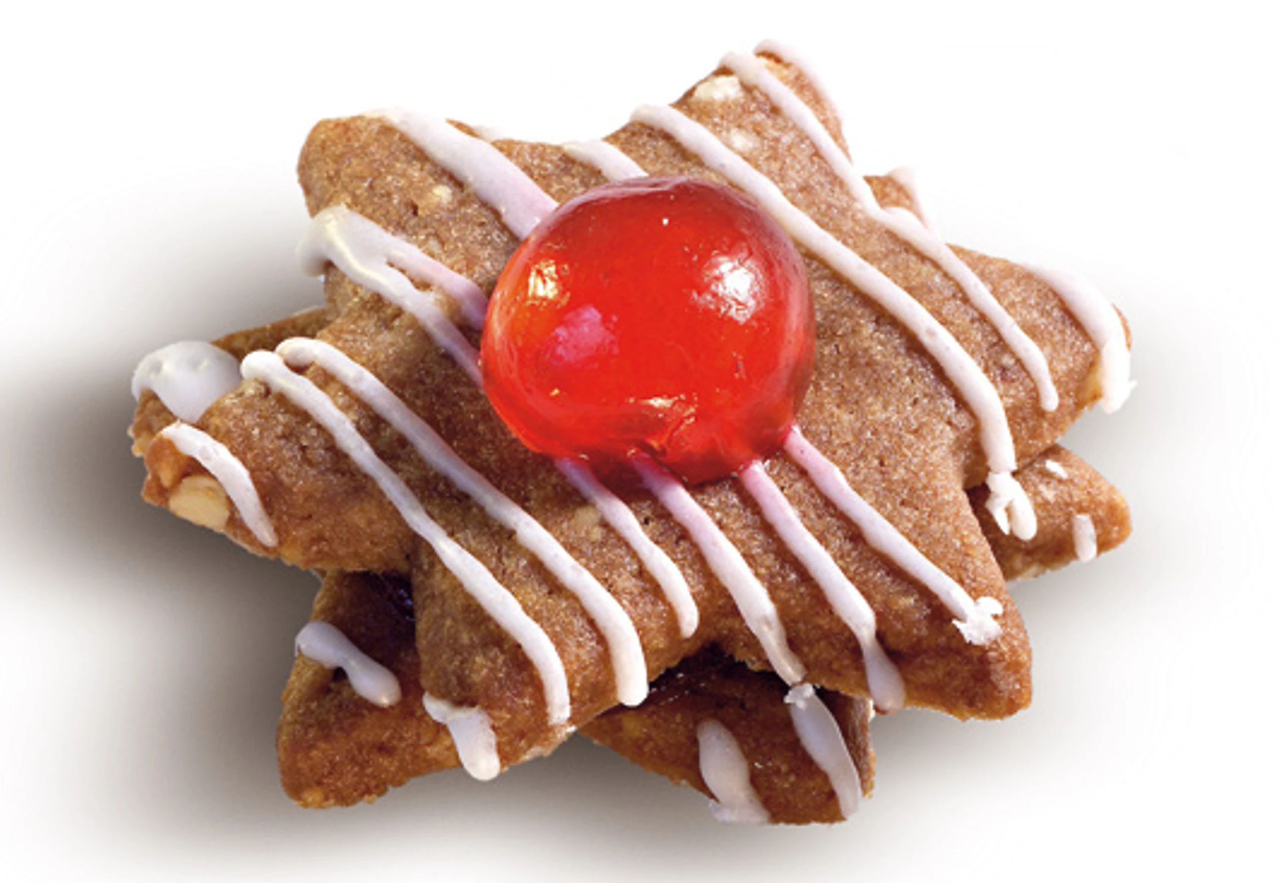 Je 2 Kekse mit Marmelade zusammensetzen. Kirschen halbieren. Für die Glasur Eiklar mit Zucker und Zitronensaft verrühren. Sterne auf Backpapier setzen, mit der Glasur streifenförmig verzieren und mit Kirschen belegen. Glasur fest werden lassen.