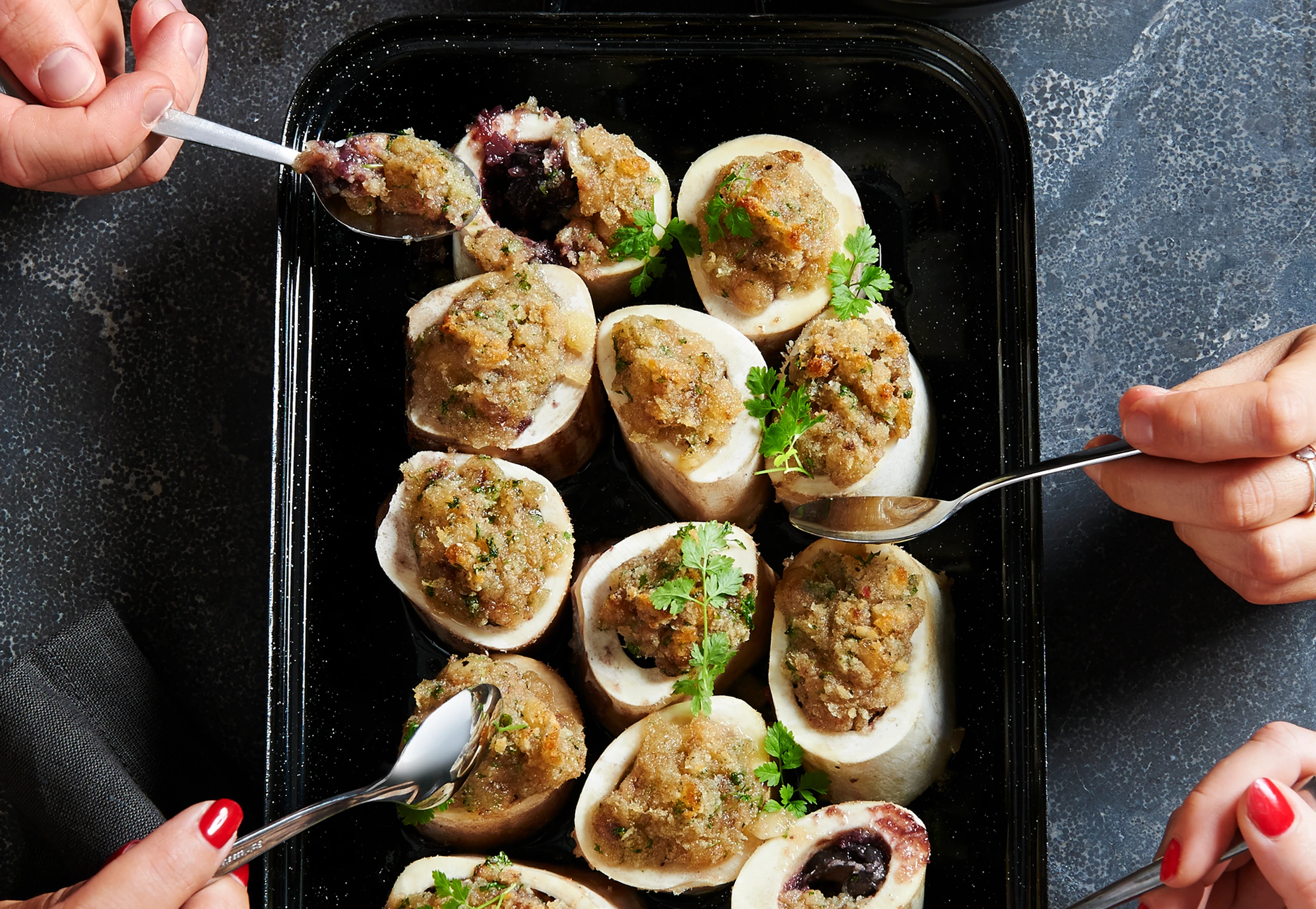 Rohr auf 240°C vorheizen. Auflaufform (30 x 20 cm) vorbereiten. Knochen mit der größeren Öffnung nach oben in die Form setzen und zu einem Drittel mit der Zwiebelmischung füllen. Pro Stück vier Schnecken einsetzen, mit dem Schneckenfond beträufeln und mit der Markmasse bedecken.