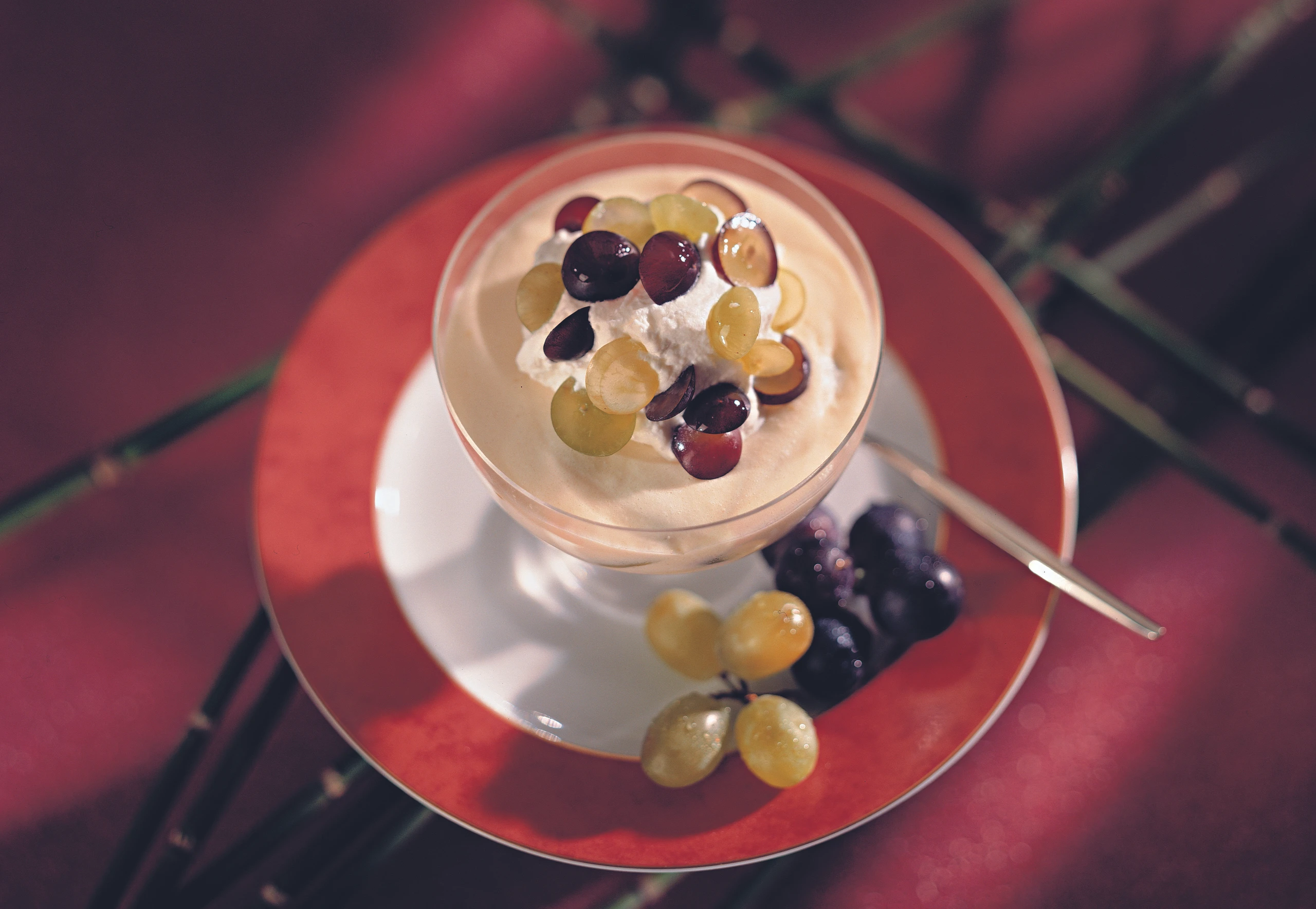 Eiklar zu cremigem Schnee, Obers halbfest schlagen. Die marinierten Trauben in die Dottermischung rühren, Eiklar und Obers unterheben. Creme in Gläser füllen und im Kühlschrank fest werden lassen (dauert mindestens 3 Stunden).