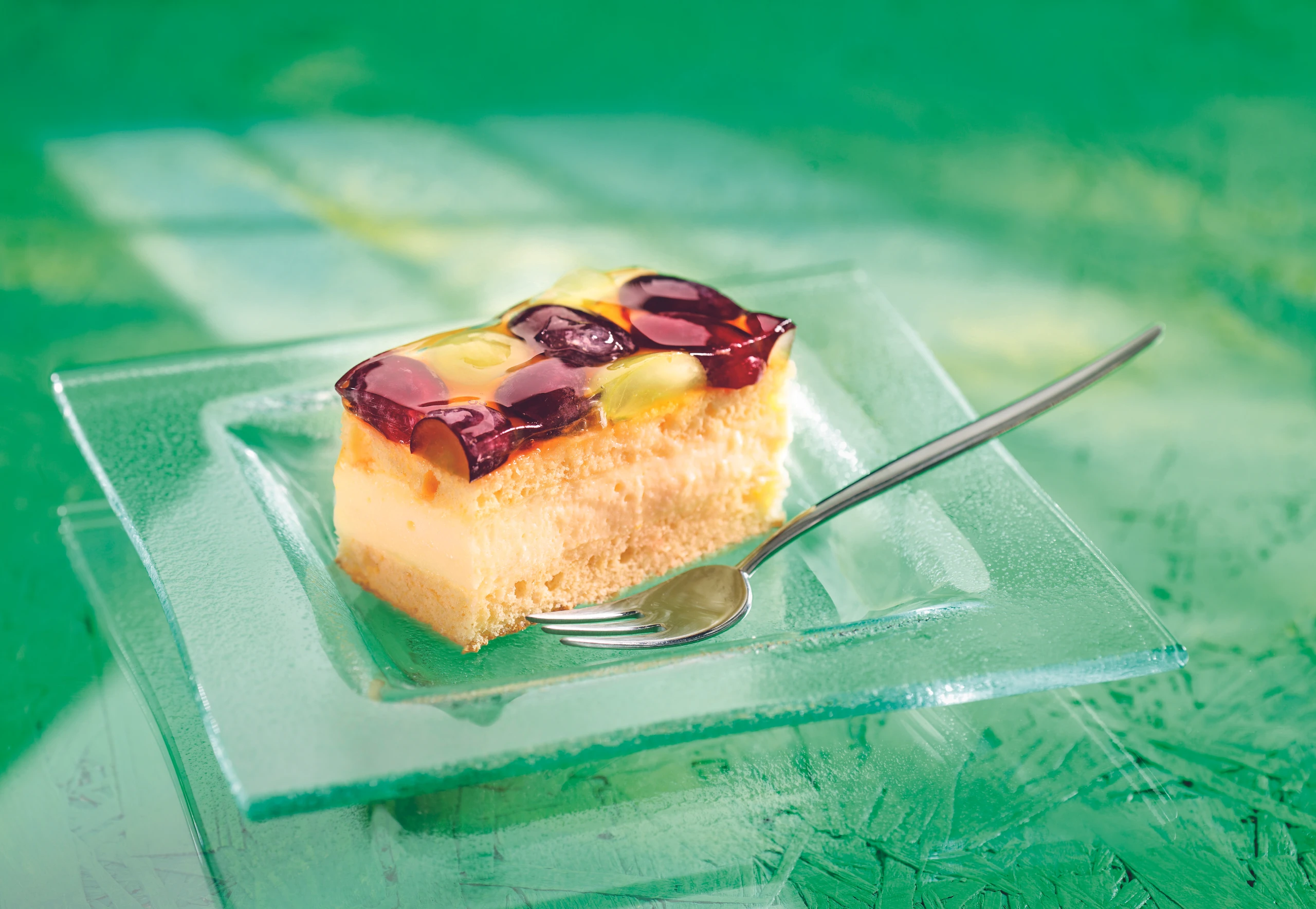 Für die Garnitur Trauben halbieren. Schnitte dünn mit Marmelade bestreichen und mit den Trauben (Schnittfläche nach unten) belegen. Tortengelee laut Anweisung zubereiten. Trauben mit dem Gelee einstreichen. Schnitte für ca. 30 Minuten kühl stellen.