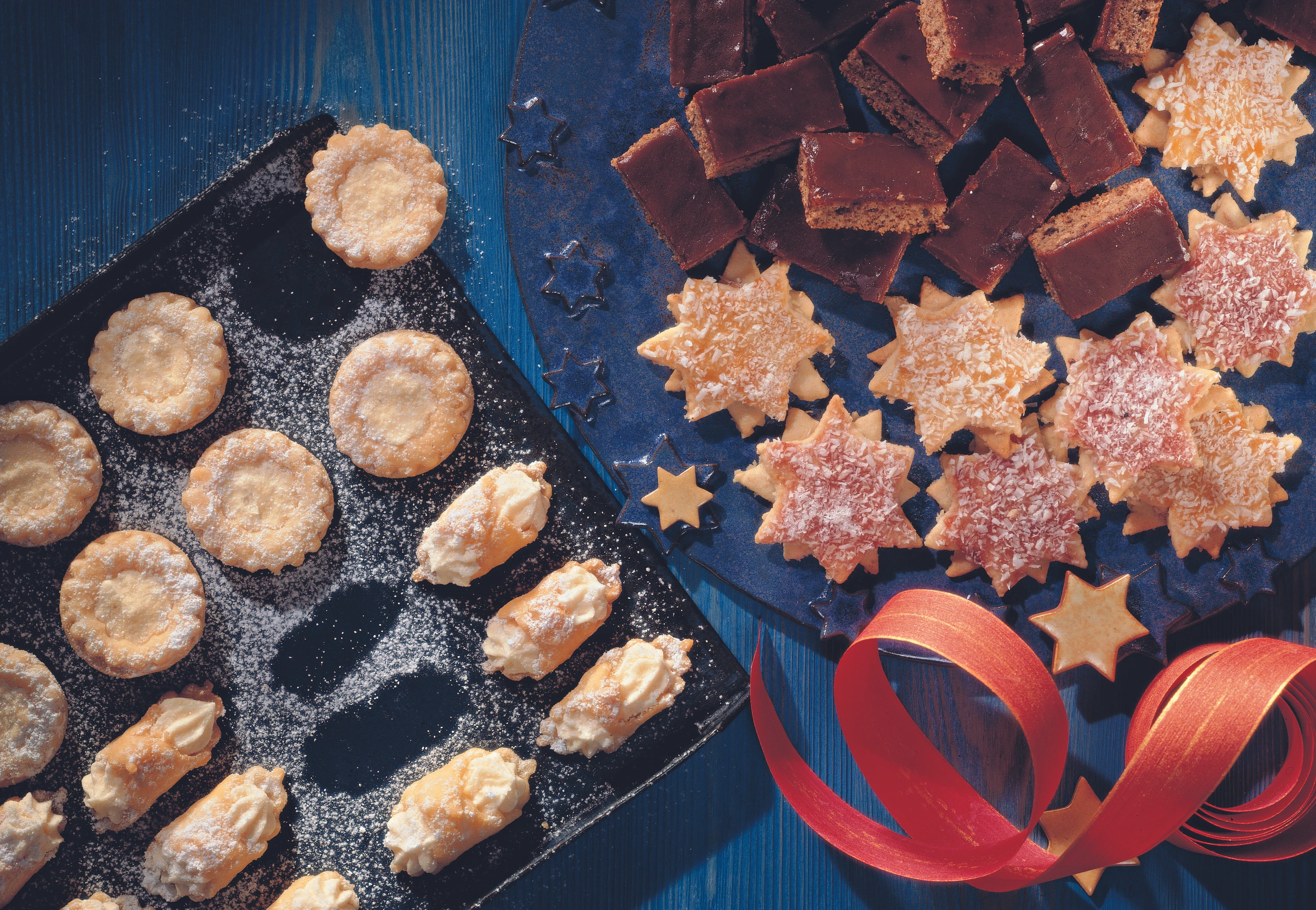 Teig auf einer leicht bemehlten Arbeitsfläche messerrückendick ausrollen. Mit einem gezackten Ausstecher (Ø 4 cm) Scheiben ausstechen. Aus der Hälfte der Scheiben nochmals kleine Scheiben (Ø 1 cm) ausstechen, sodass Ringe entstehen.