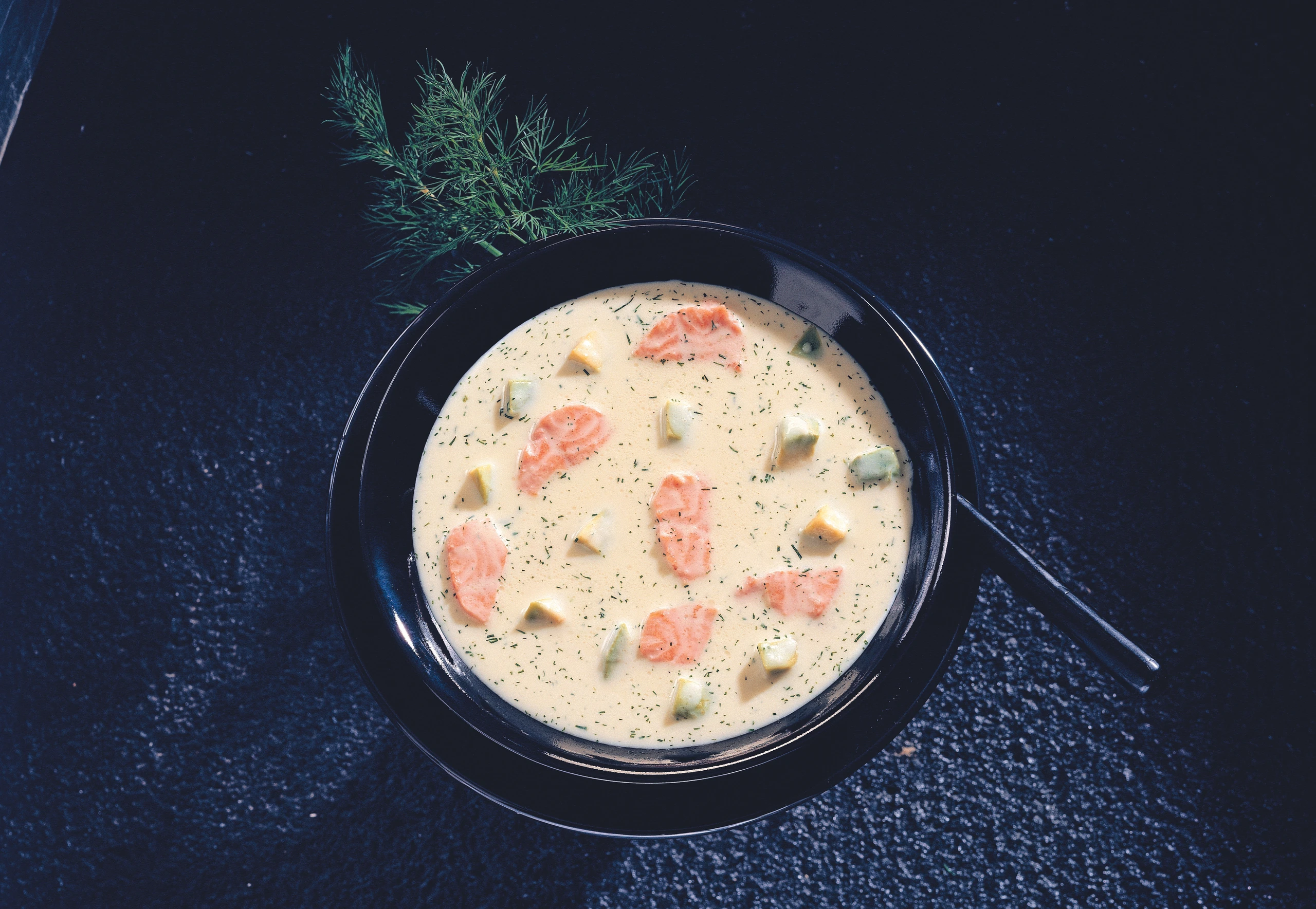 Zuerst Forellen-, dann die Avocadostücke in 1 TL Butter kurz anschwitzen, auf Küchenpapier gut abtropfen lassen und in vorgewärmte Teller legen. Dille in die Suppe rühren. Suppe mit einem Stabmixer aufschlagen und in die Teller schöpfen.
