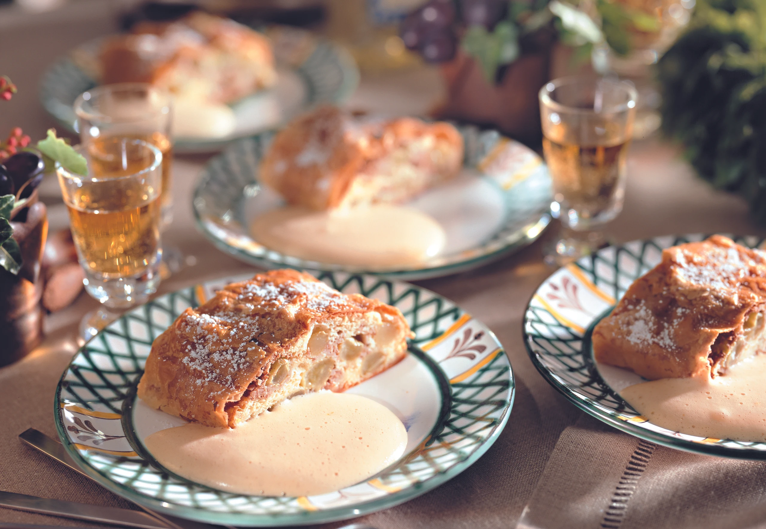 Rotwein mit Dottern, Kristallzucker und Vanillezucker verrühren. Mischung über Wasserdampf dickcremig aufschlagen und sofort mit dem Strudel anrichten.