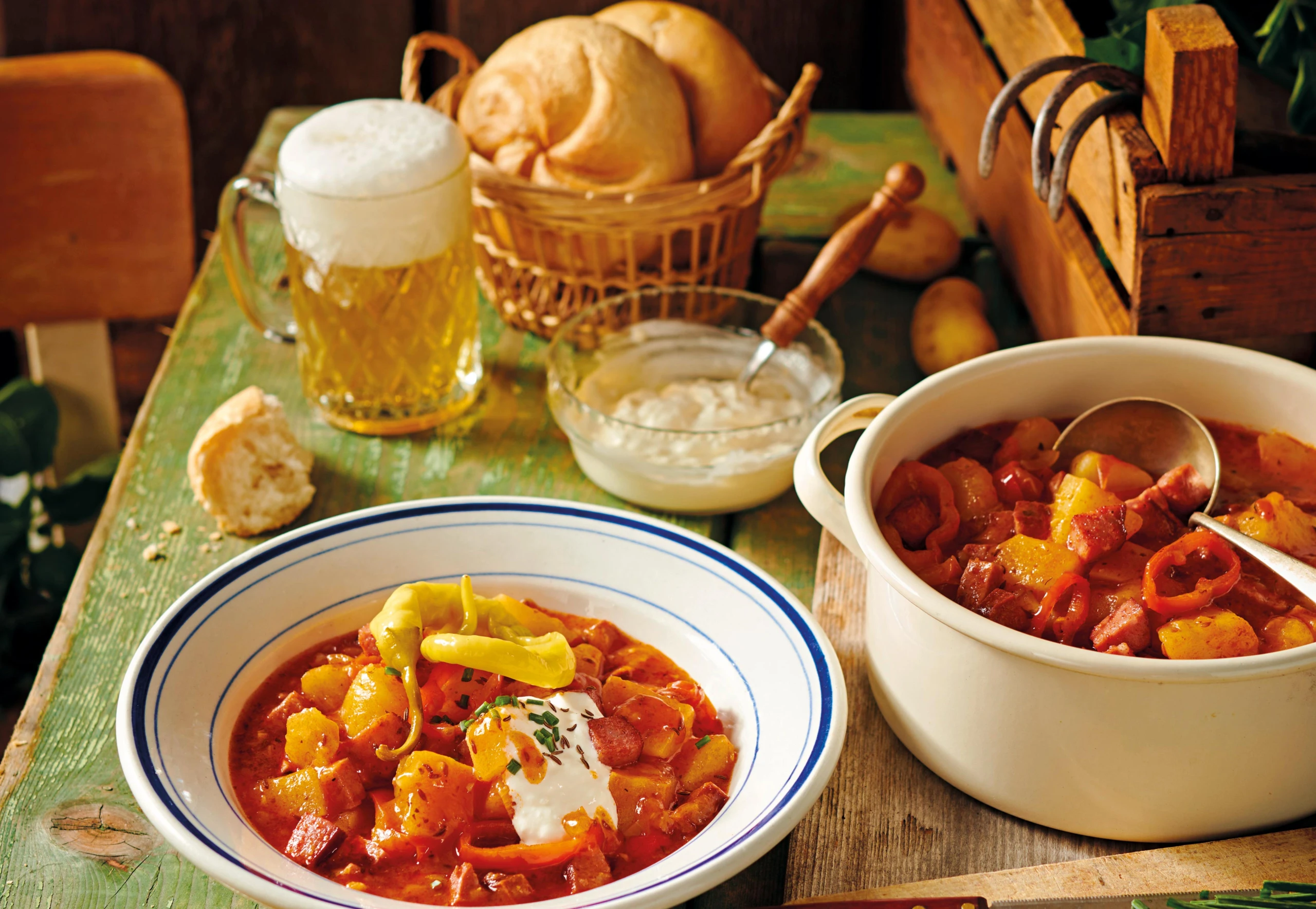 Erdäpfelgulasch mit Salz und Pfeffer abschmecken und mit Sauerrahm, Schnittlauch und Pfefferoni garniert servieren.