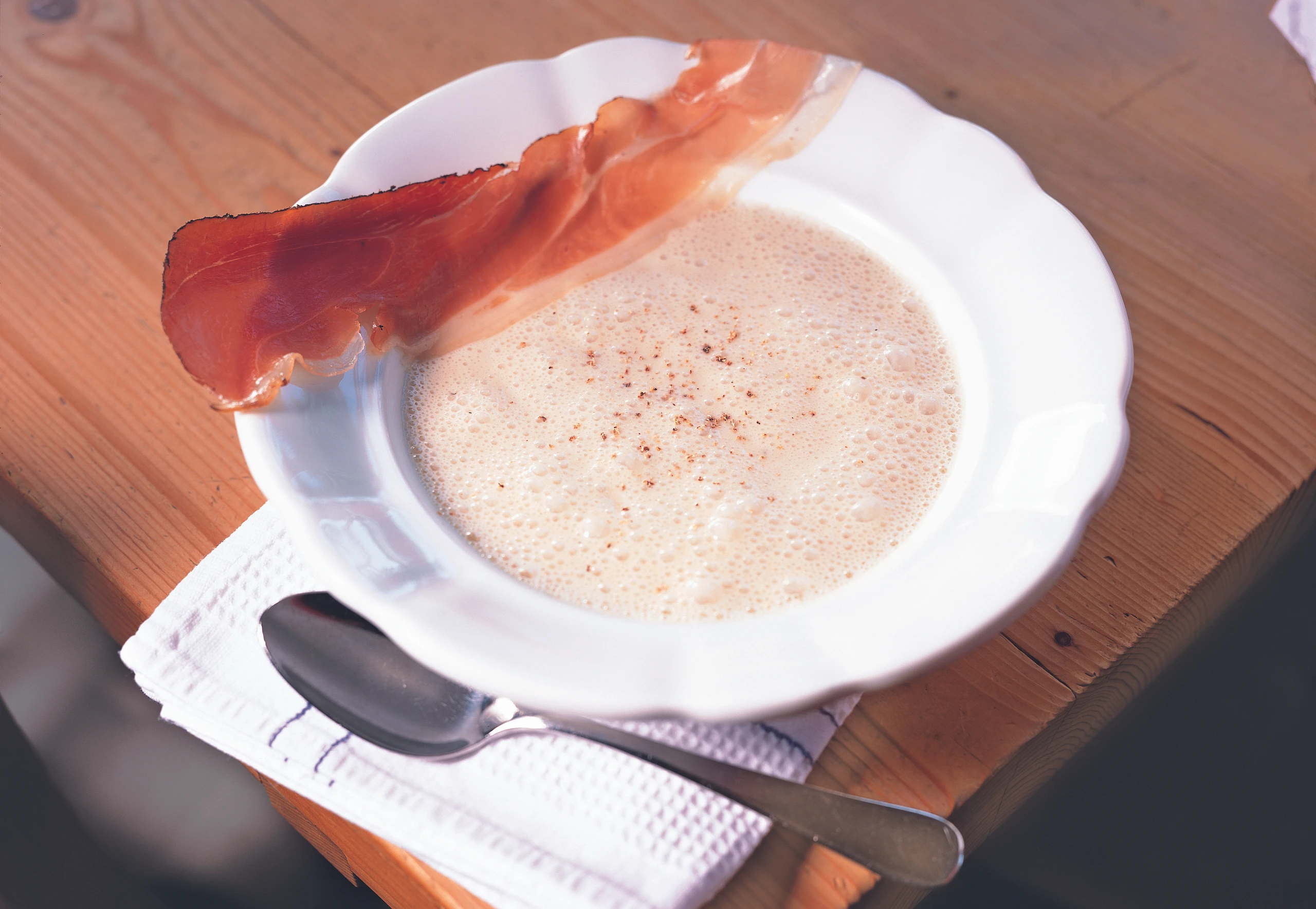 Suppe mit Schinken garnieren und mit Muskat verfeinert servieren.