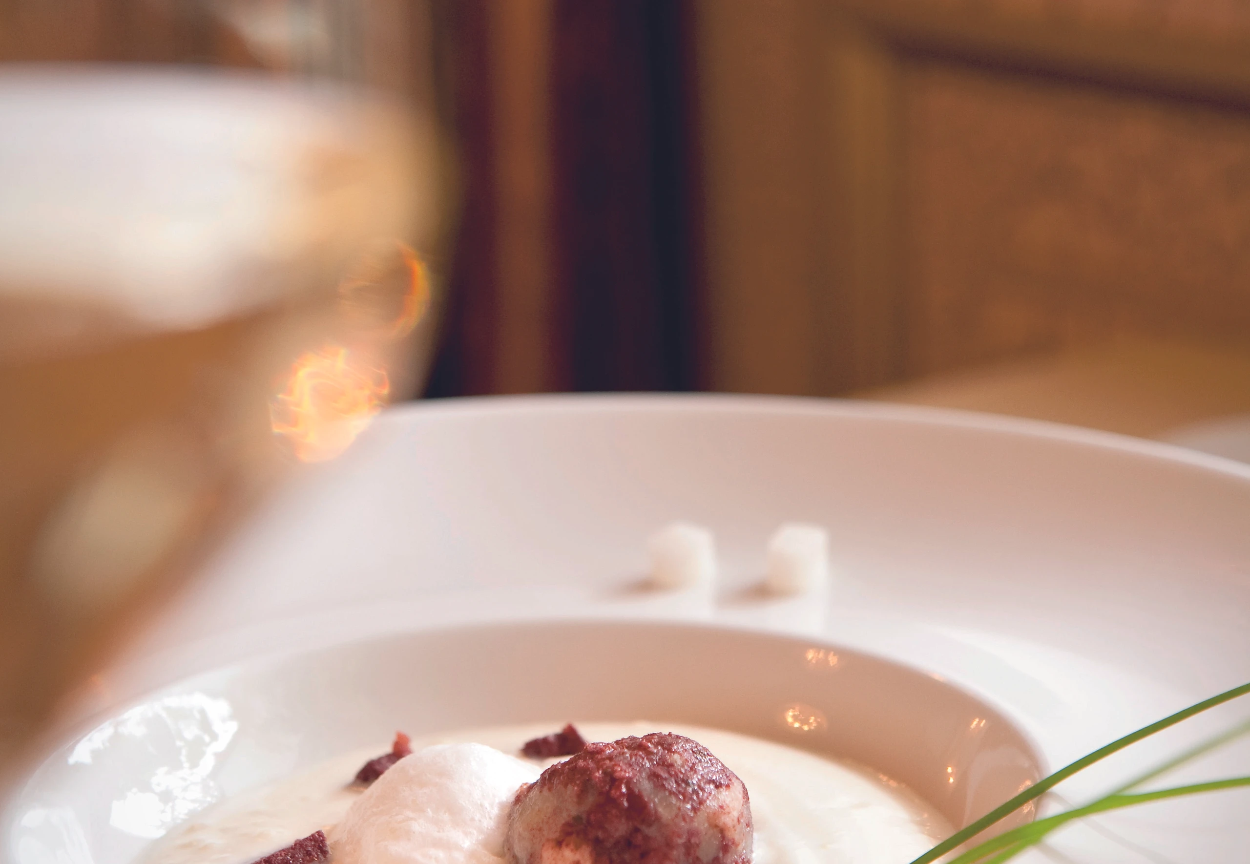 Für die Suppe Rettich, Erdäpfel und Zwiebel schälen, klein schneiden, in Butter anschwitzen, mit Wein und Suppe aufgießen. Gemüse weichkochen (ca. 20 Minuten). Nach halber Garzeit Obers zugießen. Suppe mit Salz, Pfeffer und Muskat würzen und pürieren.